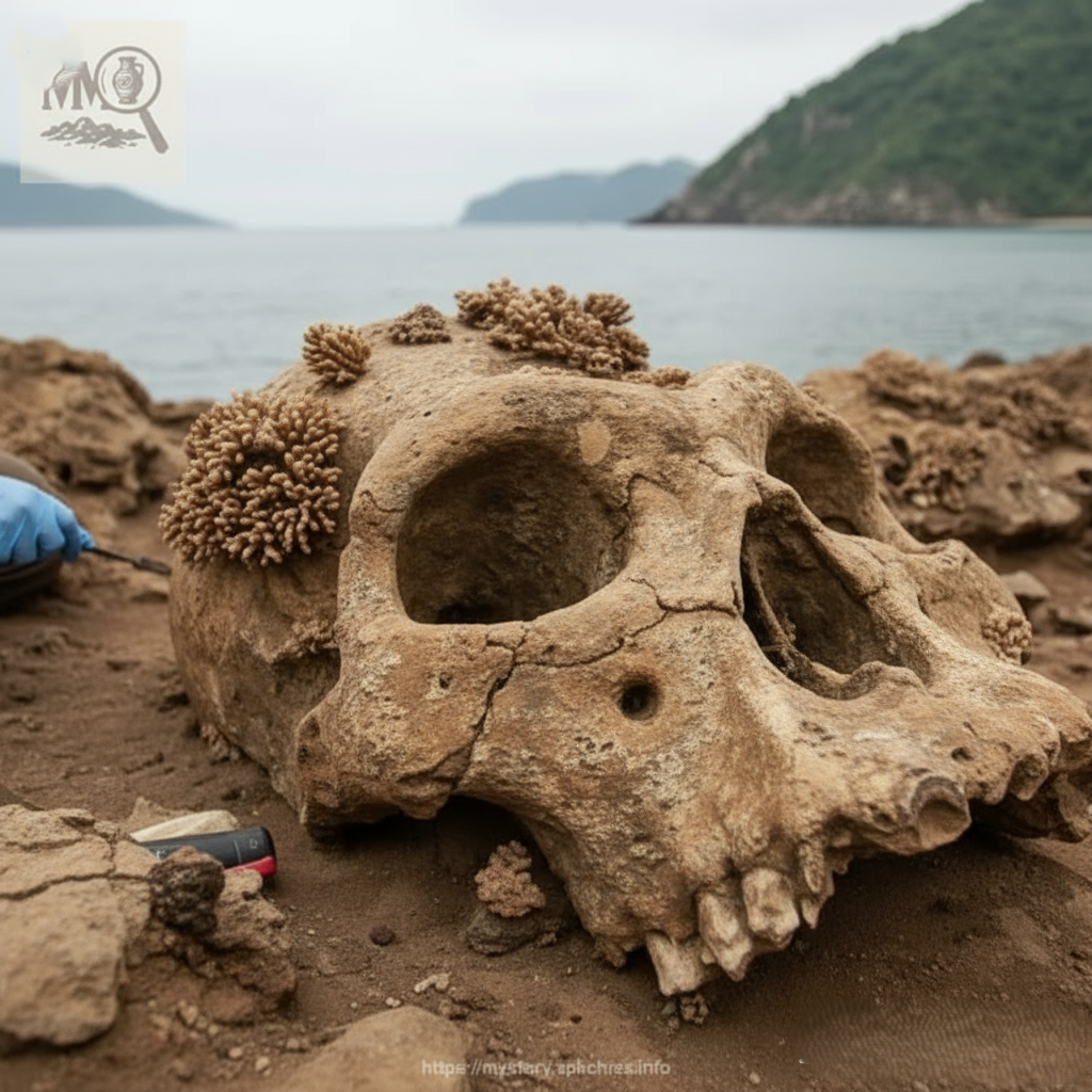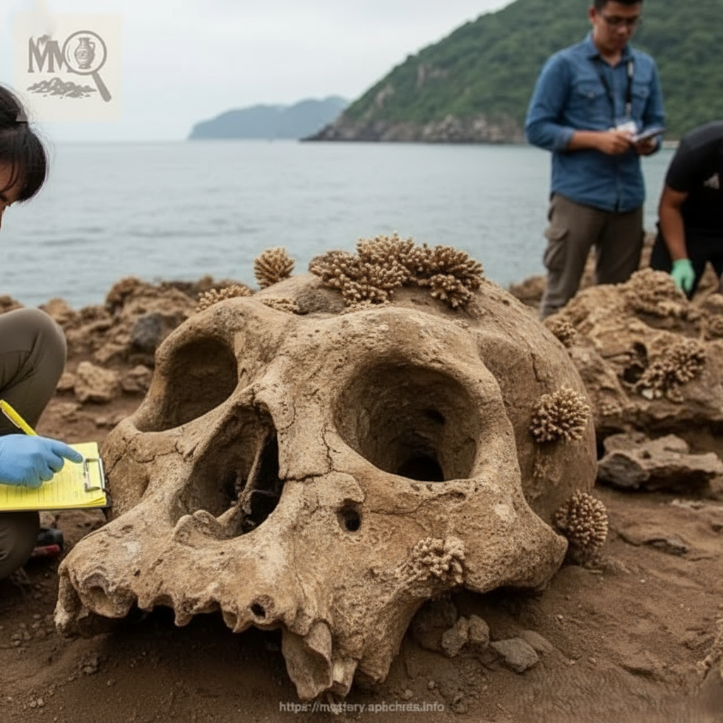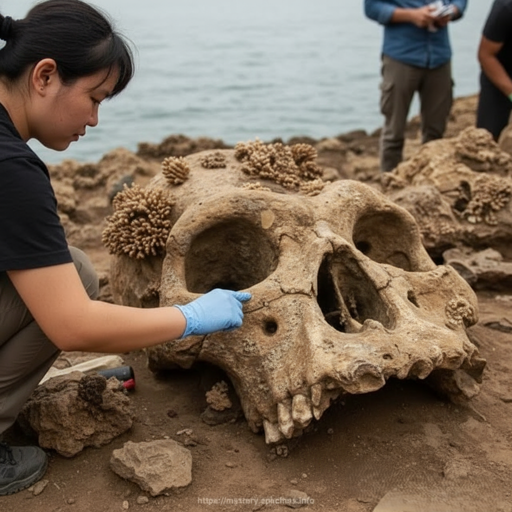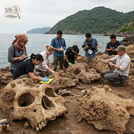 Waves crashing against a desolate coastline have revealed what may be one of the most baffling archaeological and biological discoveries of the century—enormous skulls, their surfaces covered in barnacles, corals, and hardened marine deposits, lying half-buried in the sand. Researchers on site describe the skulls as unlike anything catalogued in modern science: their size dwarfs that of a human, and their structure doesn’t align with any known species of marine mammal or terrestrial creature.