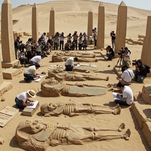 In a barren desert where the wind whips endlessly across sand and stone, archaeologists have stumbled upon a discovery that is shaking the very foundation of human history. Beneath a cluster of towering obelisks, perfectly aligned as if guarding a forgotten realm, a row of colossal skeletons has been uncovered—each resting in intricately carved sarcophagus-like recesses in the earth. The skeletons, measuring far beyond human proportions, are adorned with ornate stone designs that suggest deliberate preservation and reverence.