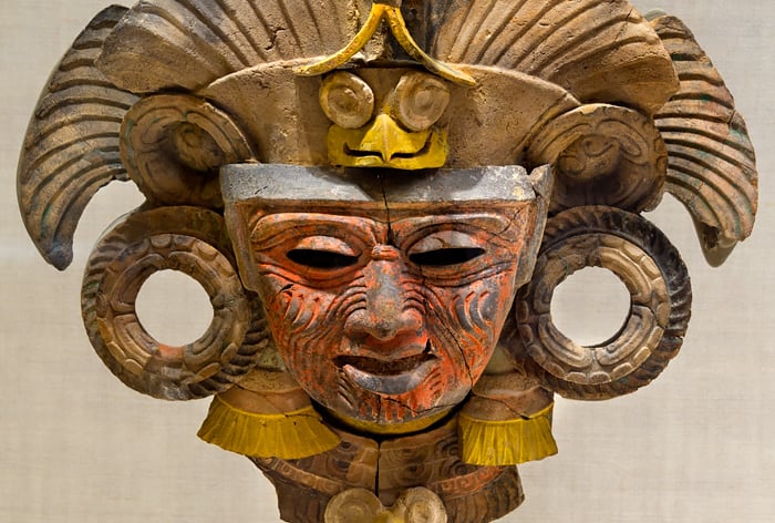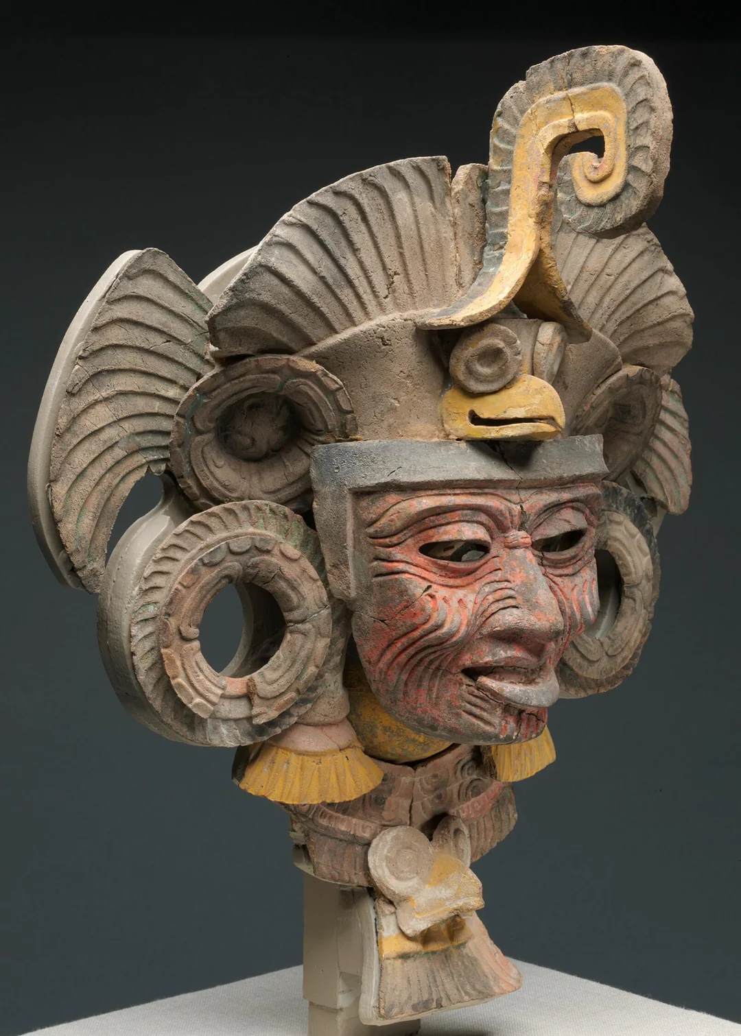 This striking mask, originally part of an incense burner, represents the aged fire deity of Teotihuacan, an important urban and religious center in central Mexico between 450 and 750 AD.