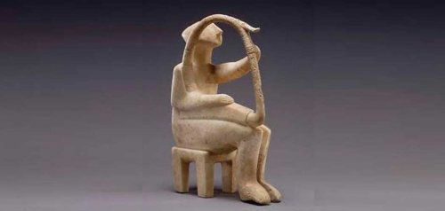 This Cycladic figurine of a harp player, dating from around 2700–2300 BCE, is a remarkable example of early Aegean art.