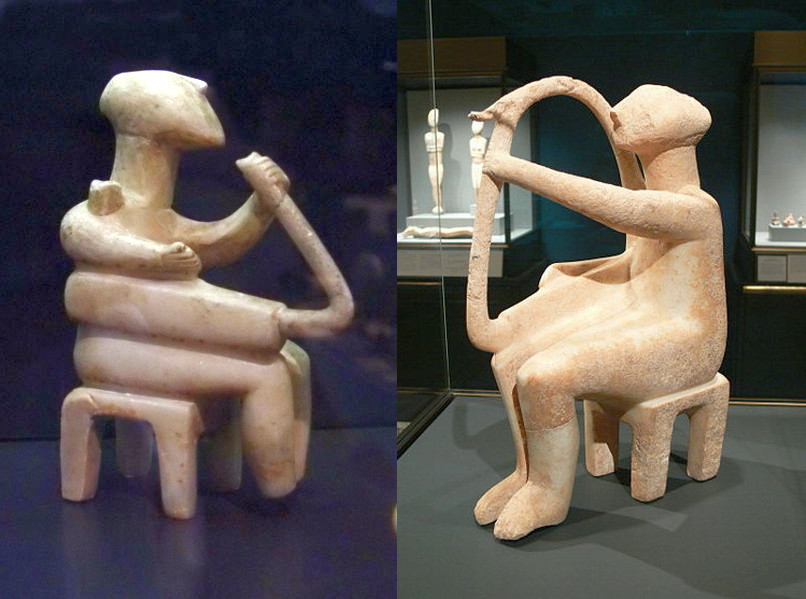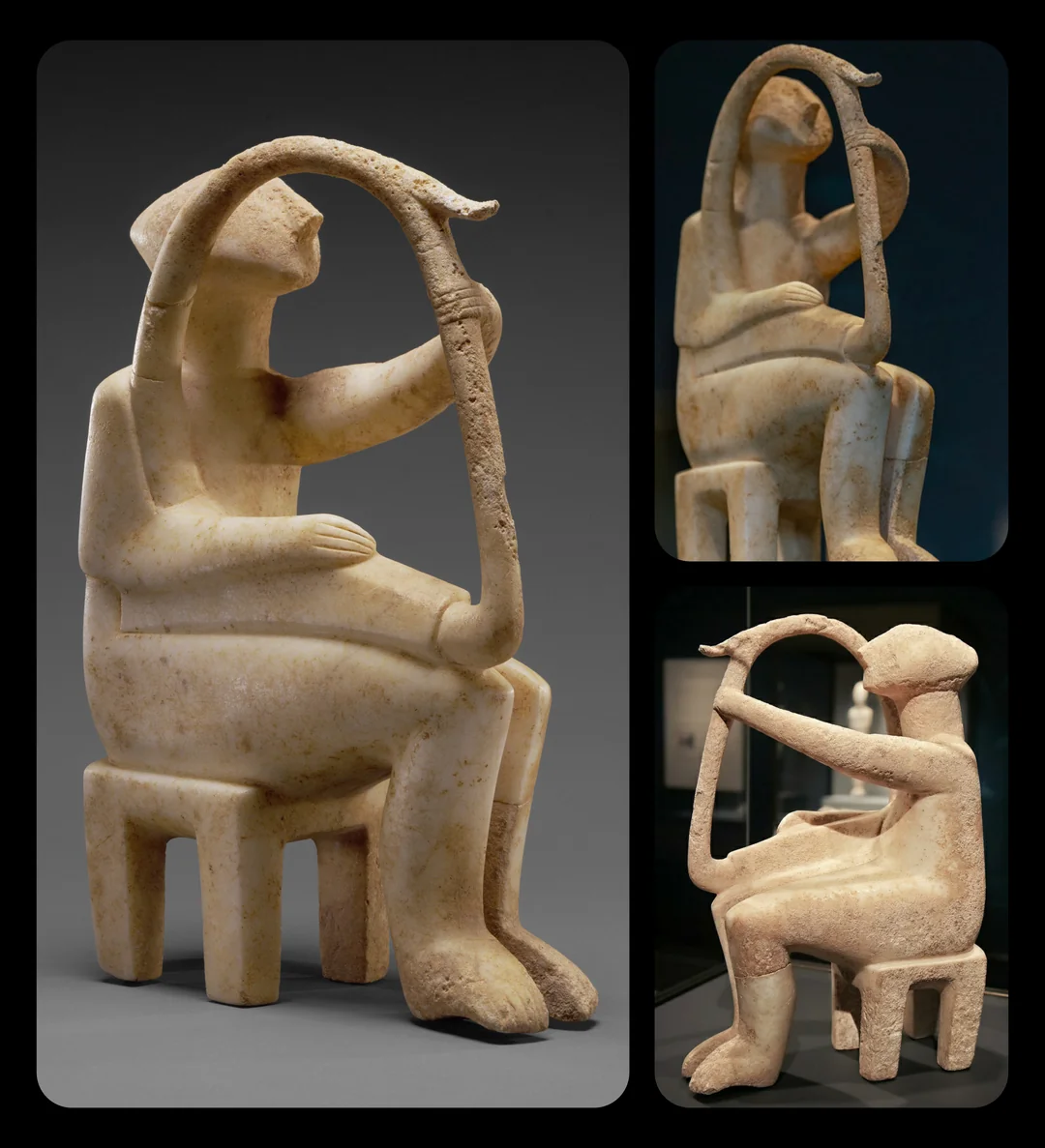 This Cycladic figurine of a harp player, dating from around 2700–2300 BCE, is a remarkable example of early Aegean art.
