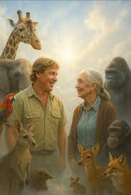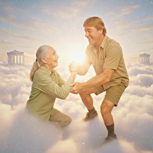 While the information regarding Jane Goodall’s passing is incorrect (she is alive and actively working! Born April 3, 1934), the image of her meeting Steve Irwin in heaven is a beautiful tribute to two extraordinary lives.