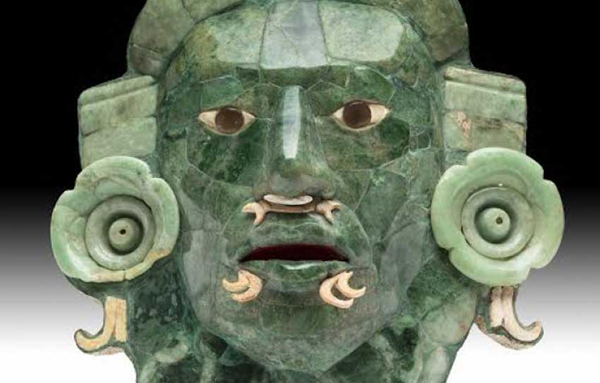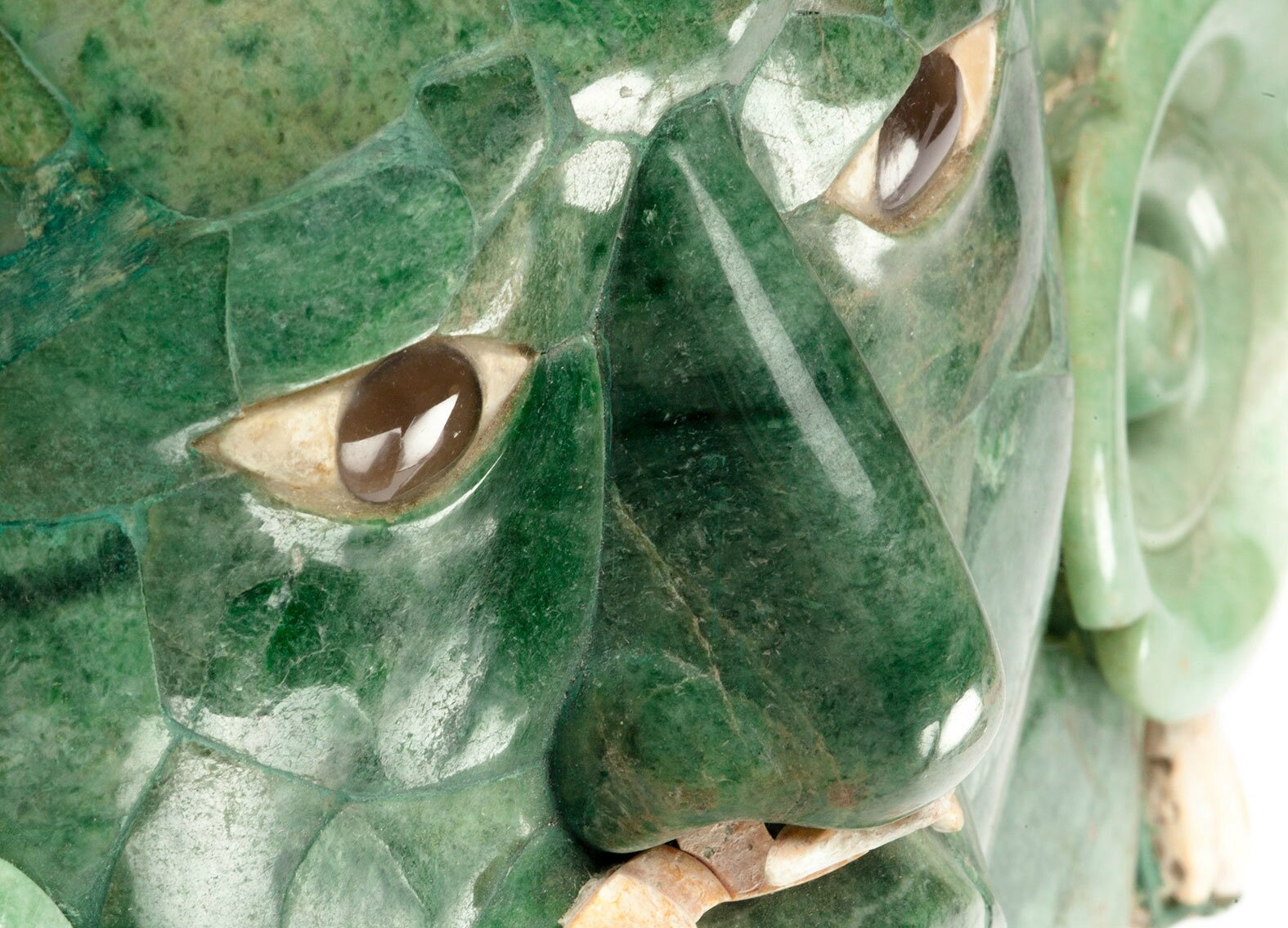 Crafted from 57 jade tiles, two obsidian beads, and a seashell, the mask is a masterpiece of Maya art. Jade held profound spiritual significance for the Maya, symbolizing vital breath, fertility, and rebirth. Its design features earflares shaped like four-petaled flowers, representing the Mesoamerican cosmic model, and shell fangs resembling a serpent, alluding to the celestial and divine realms.