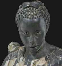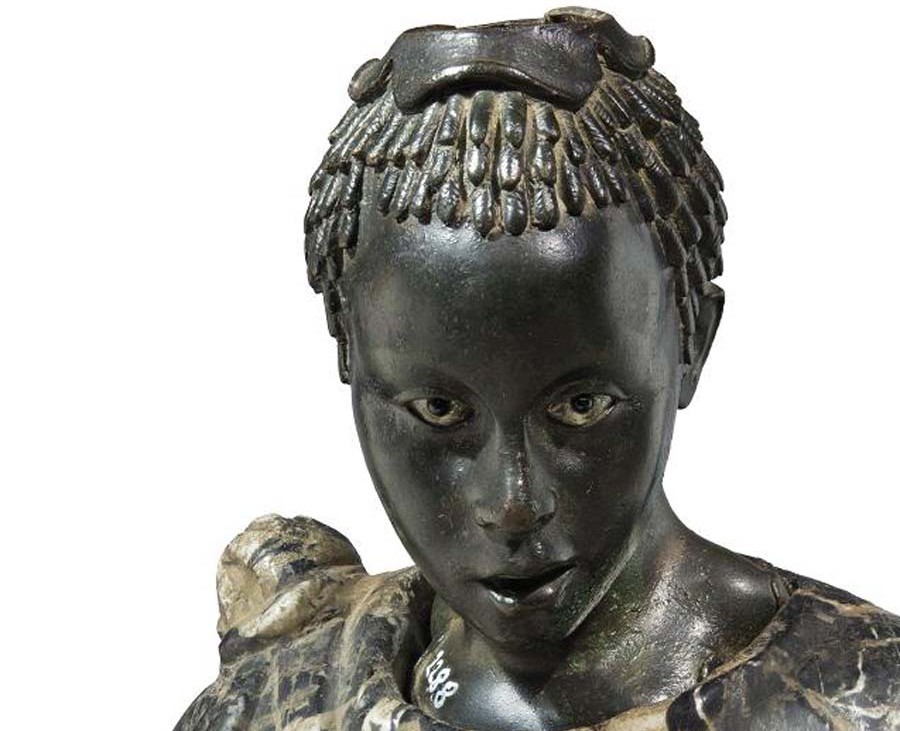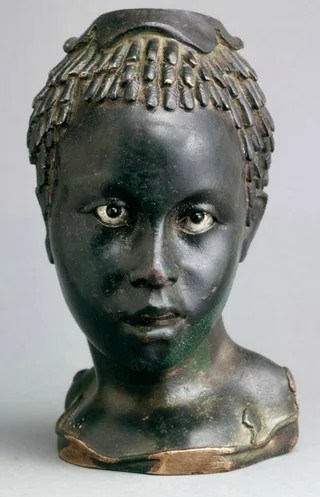 This bronze balsamarium, crafted in the shape of an Egyptian youth’s head, originates from Alexandria and dates to the 2nd century BCE.