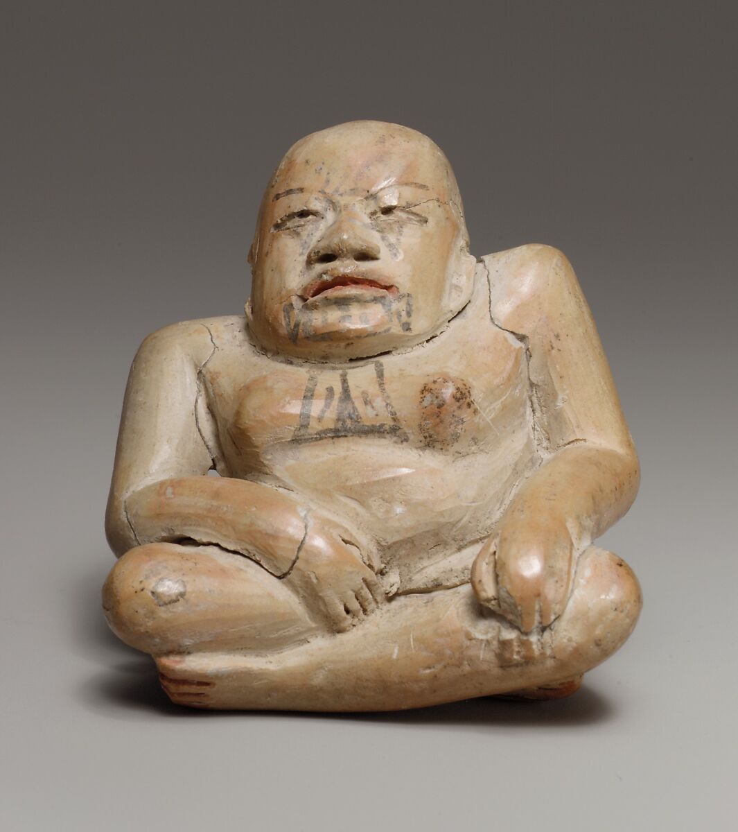 Numerous depictions of hunchbacks in ancient Mesoamerican art have led scholars to suggest that these individuals held significant social or ritual roles. Beginning with the Olmec civilization, hunchbacks were believed to possess special abilities linked to their physical differences. This Olmec figurine, with its hand-modeled, white-slipped surface, is enhanced with brown pigment to highlight both realistic and symbolic features on the face and chest.