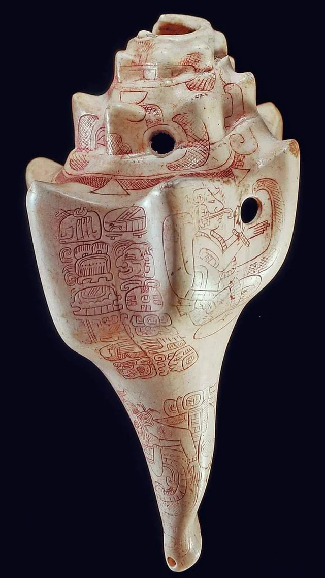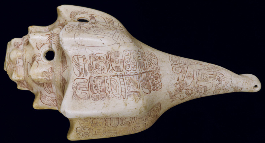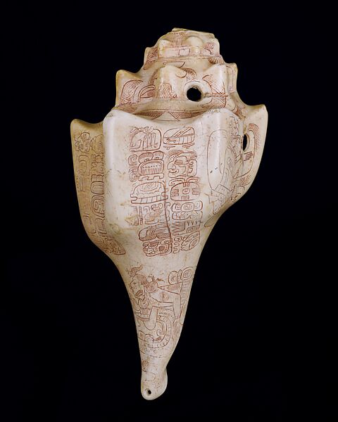 A Maya artist carved the image of an ancestor wearing an elaborate headdress onto the surface of this conch-shell trumpet.