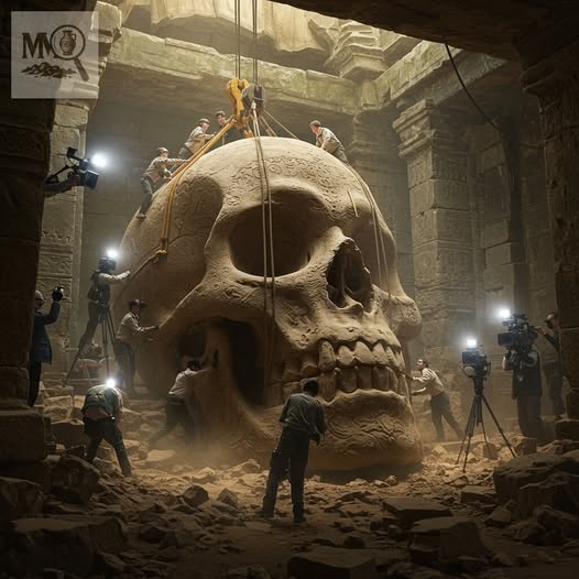 Archaeologists and journalists are reeling after the shocking discovery of a massive humanoid skull buried within the crumbling ruins of an ancient temple complex. The enormous fossil, etched with strange carvings and ancient inscriptions, measures several meters tall — so large that cranes and excavation teams were required to lift it from the ground. Experts say the find is unlike anything ever recorded in human history.