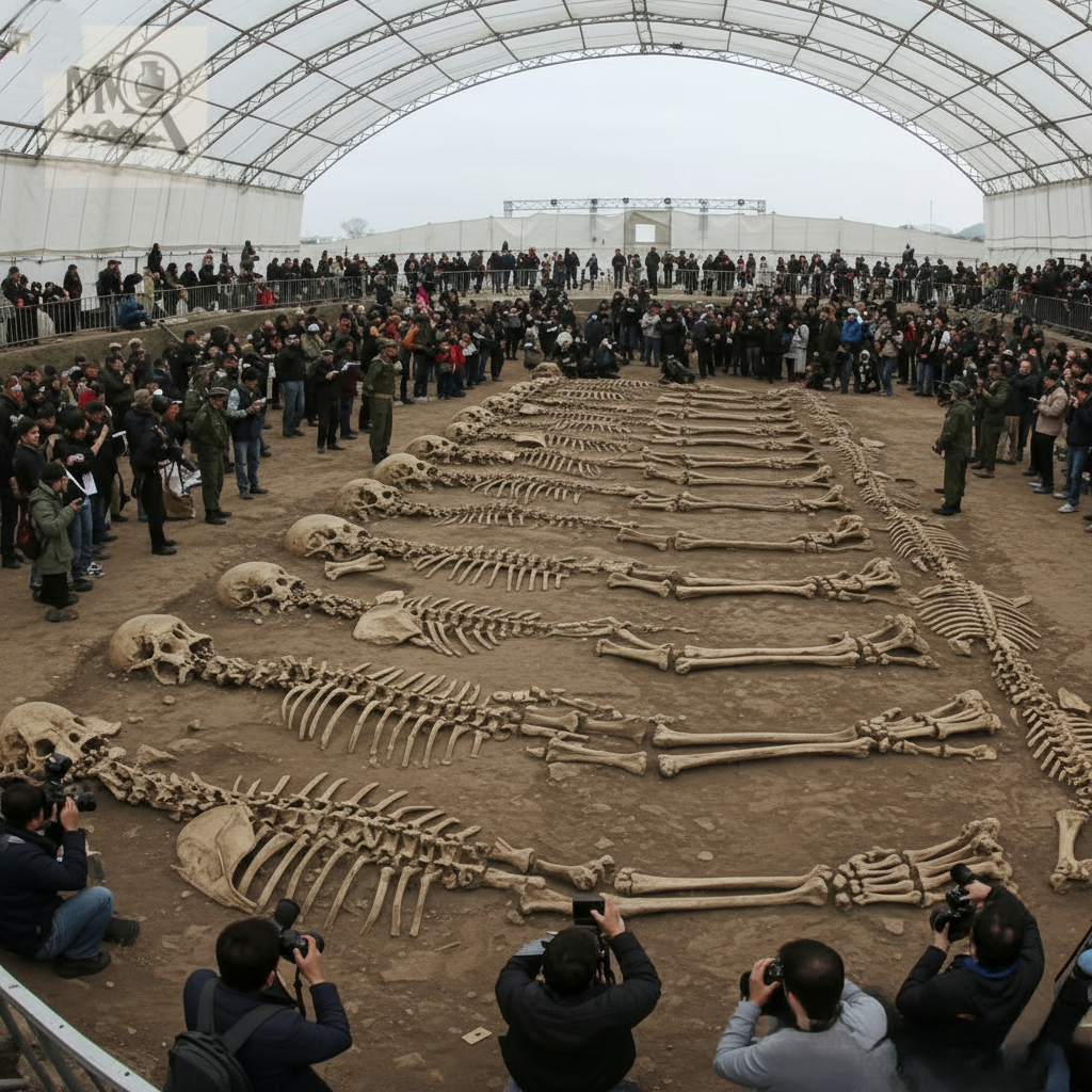 An extraordinary discovery has sent shockwaves through the world — hundreds of colossal humanoid skeletons have been unearthed and placed under a massive protective dome at an undisclosed desert excavation site. Towering in uniform rows, each skeleton stands several meters tall, their remains astonishingly intact and organized as though they once belonged to an ancient army. The discovery has drawn scientists, journalists, military officials, and an explosion of global attention — with many calling it the most unsettling archaeological revelation of the century.