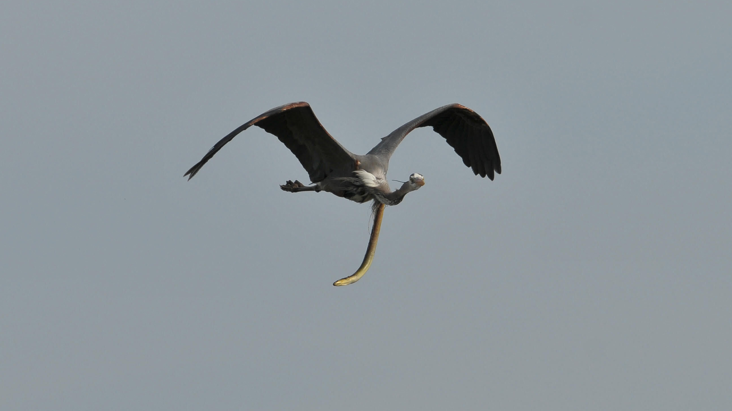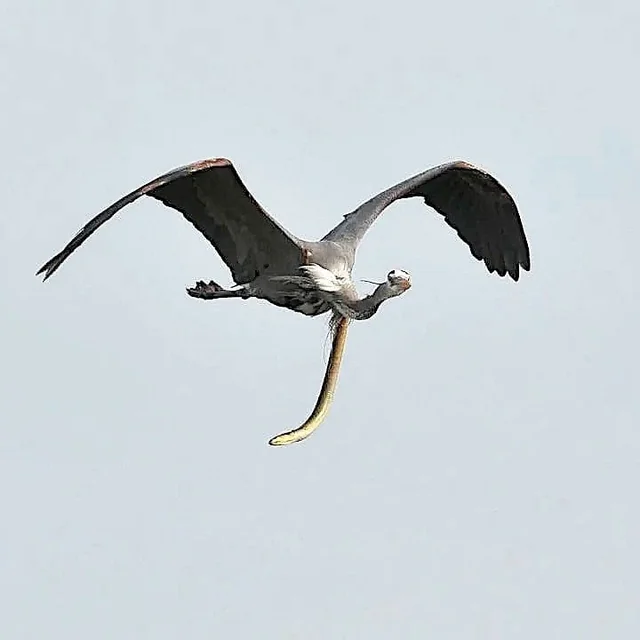 While the eel did not survive its grotesque bid for freedom, the heron’s response is what makes the image so iconic. The bird was still actively flying through the air, completely ignoring the horrific, gaping wound right in the center of its chest. It’s a staggering testament to the resilience, tolerance for immense trauma, and the fierce, unyielding will to survive in the animal kingdom.
