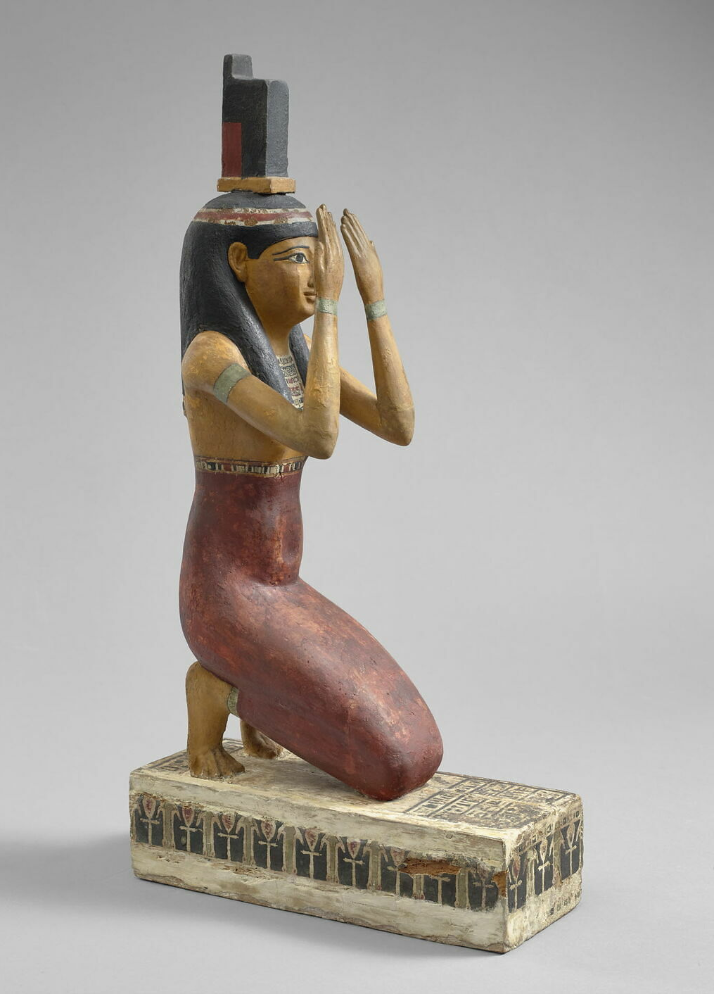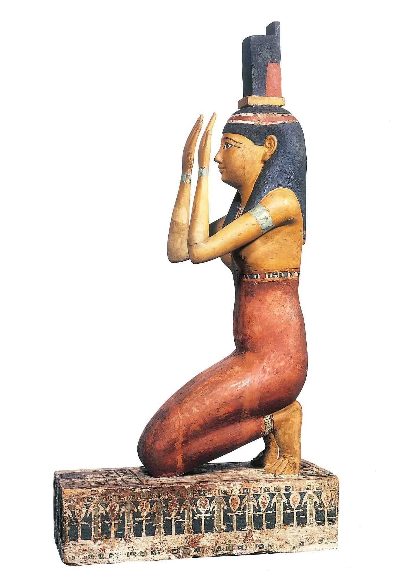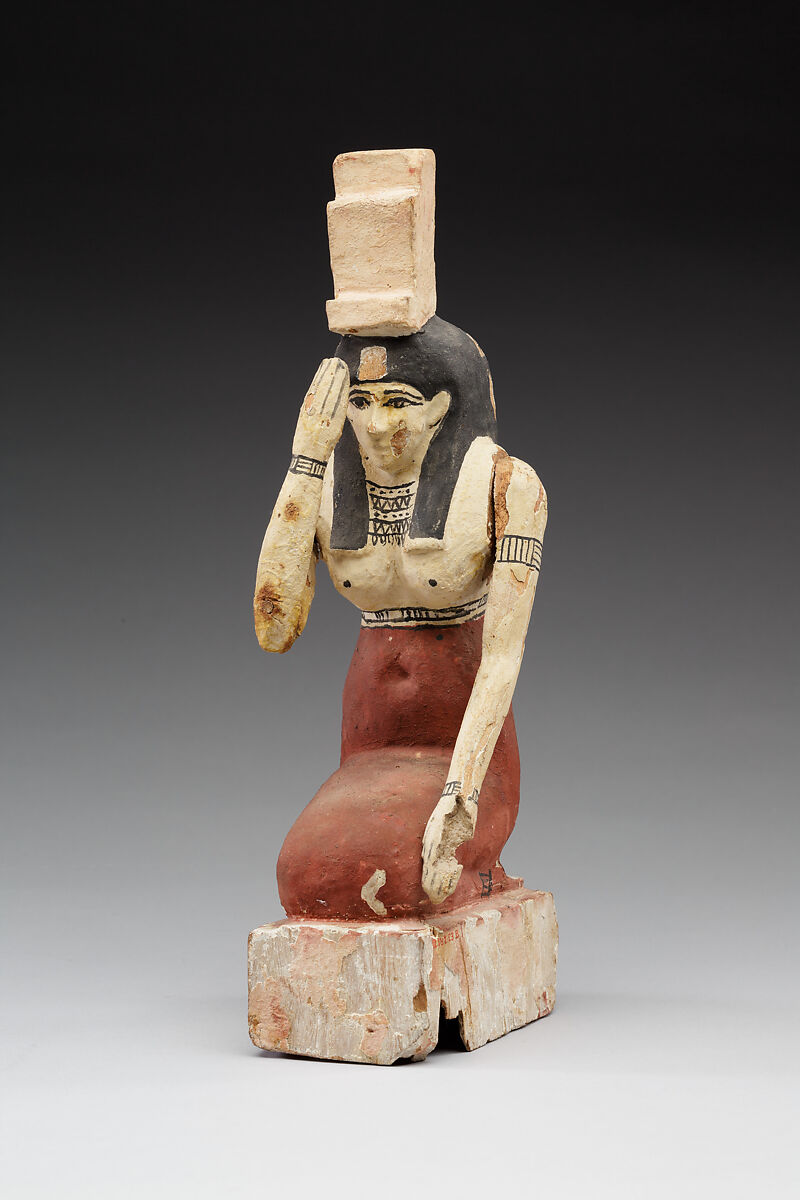 A plastered and painted wooden statue of the goddess Isis , dating to the Ptolemaic Period (332–30 BC). Isis is shown kneeling on a pedestal, wearing a long, form-fitting dress and a tripartite wig topped with the aset-seat—the hieroglyphic symbol used to write her name .