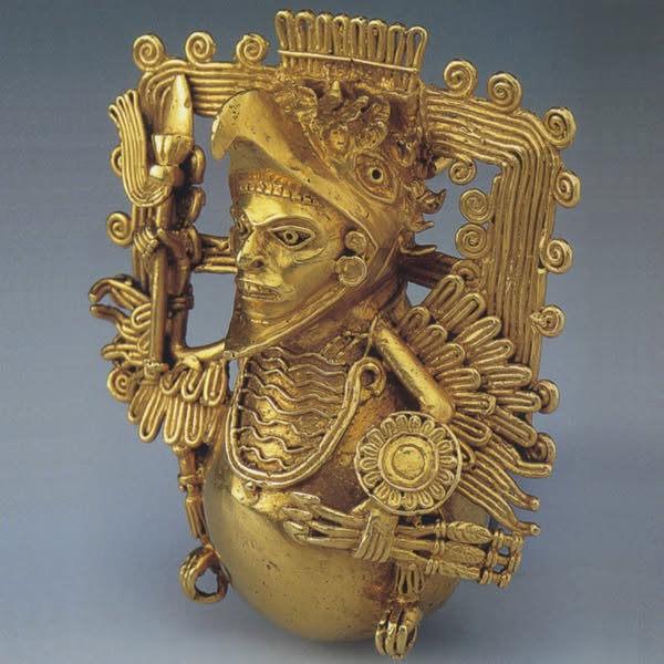 Petersburg, this exquisite pendant likely dates to the Postclassic Period (ca. 1200–1521 AD). Fashioned using the lost-wax casting technique, it depicts a fierce warrior adorned with an elaborate headdress, feathered ornaments, and weaponry, embodying courage and divine power.