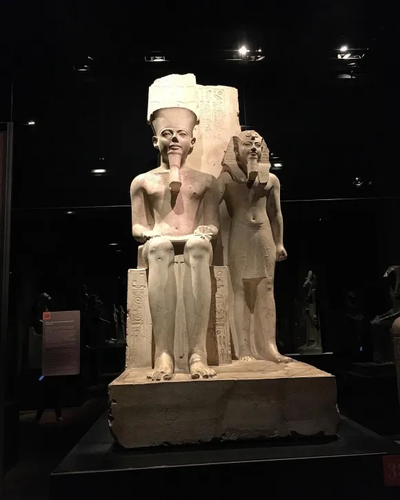 A statue depicting the god Amun seated, with Pharaoh Horemheb standing beside him.
