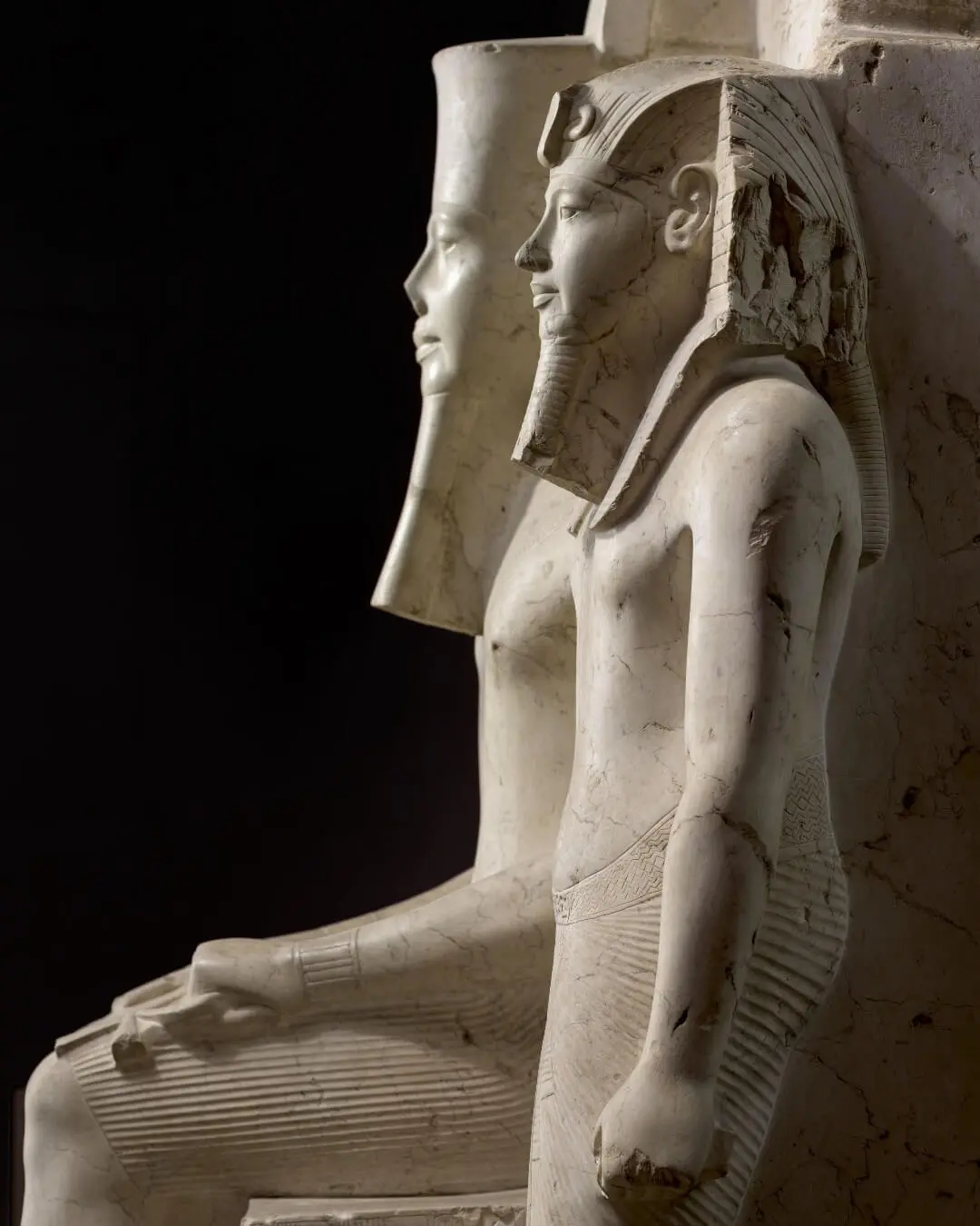 A striking work that embodies their connection is the statue of King Horemheb and the god Amun (Turin, Egyptian Museum, catalogue 768). In this statue Amun is seated on a throne, larger in scale than Horemheb, who stands beside him. The larger size of Amun emphasizes the divine hierarchy: the god’s supremacy over even the king. The statue’s style reflects the post-Amarna artistic revival — the faces are youthful, soft contours, gentler proportions, less exaggerated musculature, a return to more “classical” forms of traditional representation.