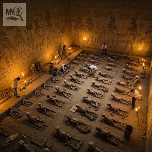 In a revelation that is shaking both the scientific and historical communities, a team of archaeologists operating beneath Egypt’s endless dunes has reportedly uncovered a vast subterranean chamber—believed to have been sealed for thousands of years. Inside, dozens of colossal humanoid skeletons lie perfectly arranged in ceremonial order, each resting beneath towering walls inscribed with intricate hieroglyphs and unknown symbols. Measuring up to four meters in height, the remains appear to belong to a race of beings long dismissed as myth.
