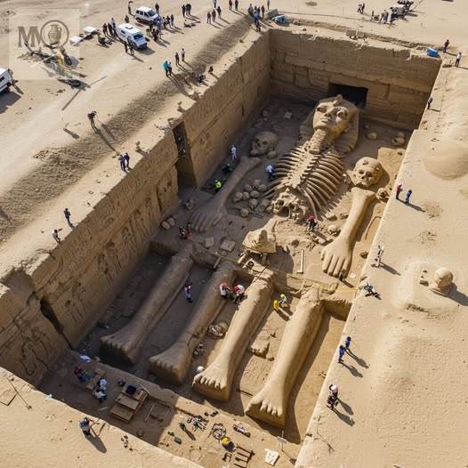 A monumental discovery beneath Egypt’s unforgiving sands has left archaeologists and historians in utter disbelief. Deep within a recently unearthed burial chamber, researchers have uncovered what appears to be the skeleton of a gigantic humanoid figure, adorned with remnants of gold ornaments and fragments of royal regalia unmistakably associated with ancient pharaohs. The bones—each limb several times larger than that of an average human—lie perfectly aligned beneath towering stone slabs carved with intricate hieroglyphs describing “the King Who Walked Among the Gods.”