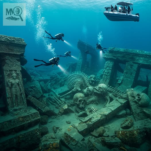 In a find that has left both scientists and historians stunned, a team of deep-sea divers and marine archaeologists has uncovered what appears to be the ruins of an immense underwater city, scattered across the ocean floor. Among the coral-encrusted temples and collapsed stone arches lie enormous humanoid skeletons, their skulls and ribcages measuring several times the size of modern humans. The site, located thousands of meters below sea level in an undisclosed region of the Atlantic, appears to stretch for kilometers—complete with roads, statues, and towering monoliths carved with unfamiliar symbols.
