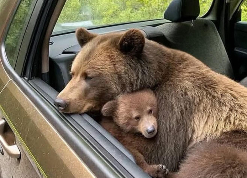 The mother bear stirred, blinking against the morning light. She let out a soft grunt, glanced at the man as if slightly offended by the interruption, and then nudged her cub awake. Together, they lumbered out of the car and ambled toward the trees, vanishing back into the forest’s shadows. The father didn’t move until he was sure they were gone. Only then did he rush to his car, heart hammering, the adrenaline surging through every vein.