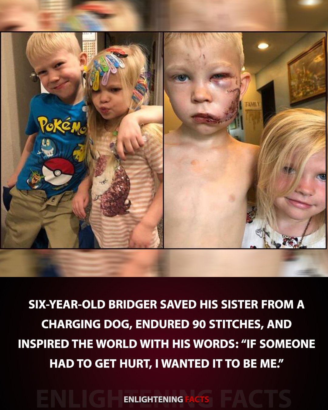 The animal attacked, inflicting severe injuries to his face and head that would later require nearly 90 stitches. Yet, even in the midst of his own pain and terror, his mission wasn’t over. Bridger, bleeding and wounded, still had the presence of mind to grab his sister’s hand and lead her away to safety, ensuring she was out of danger before he allowed his own ordeal to be addressed.