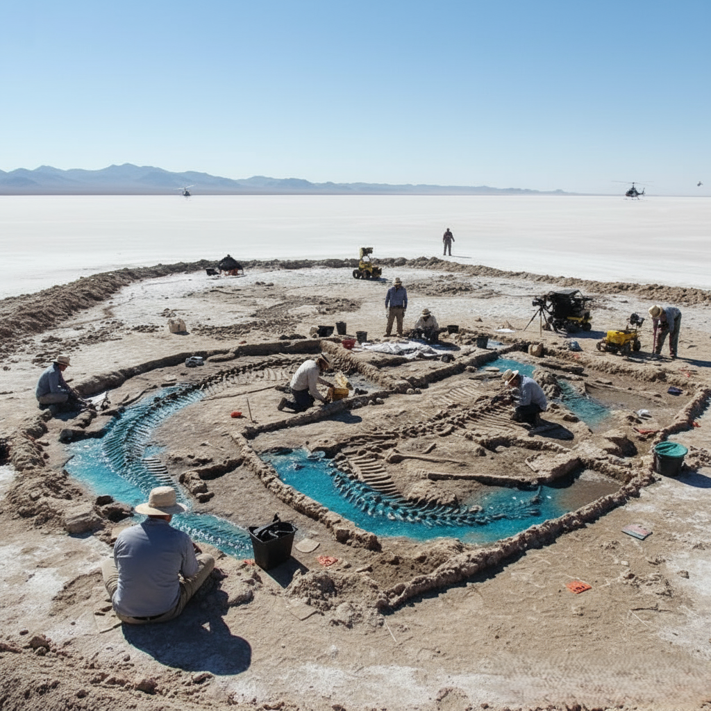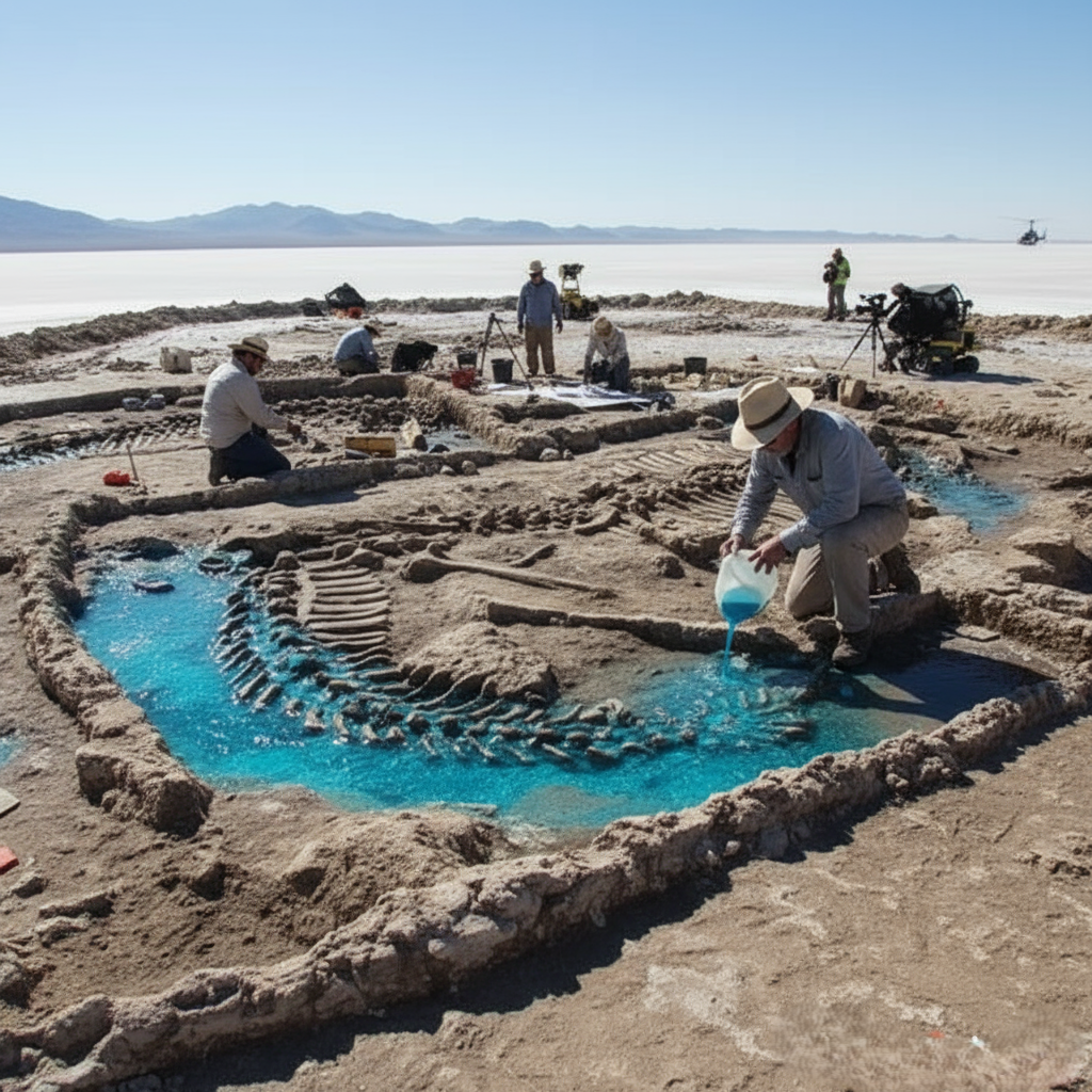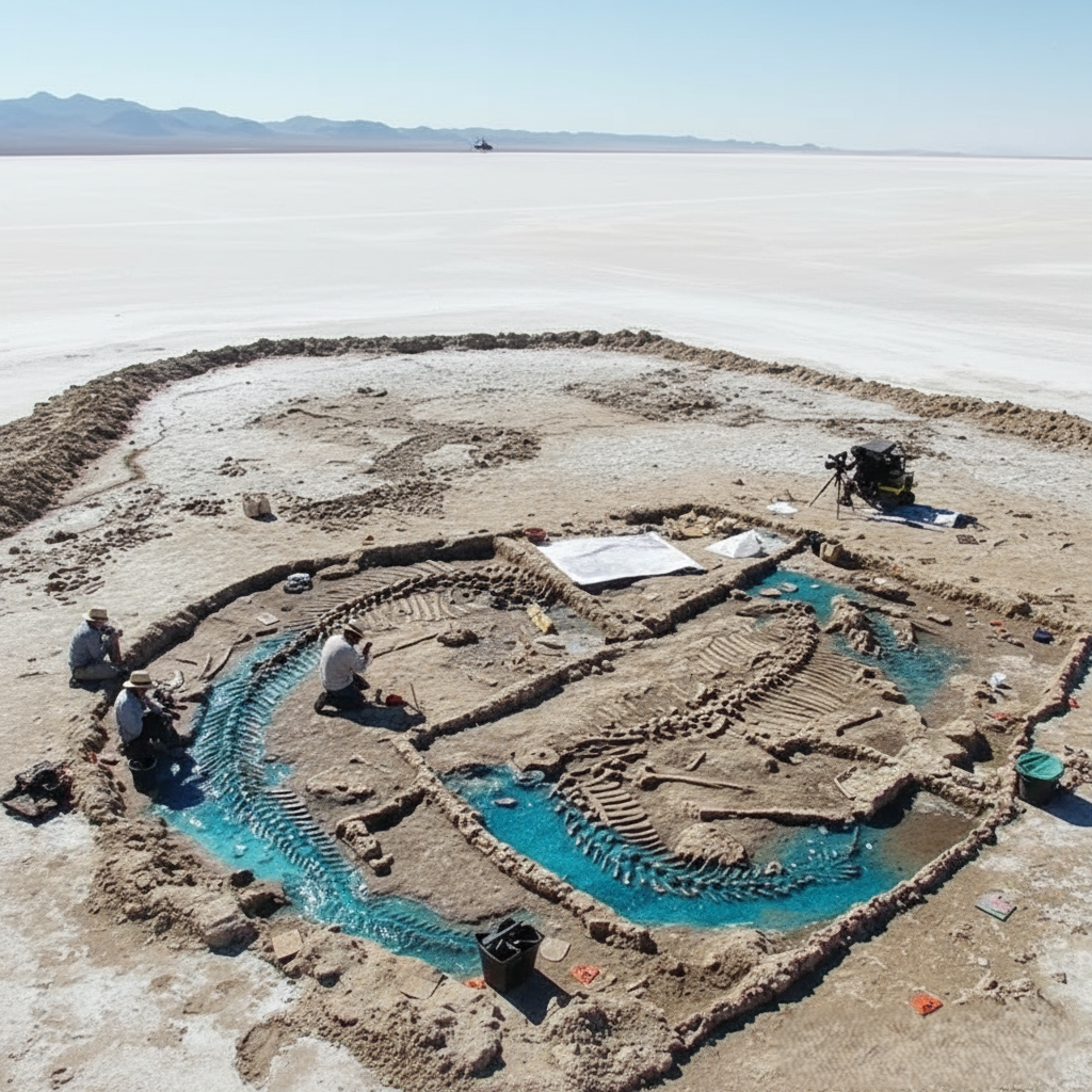 In a remote desert salt flat once thought to be lifeless and barren, a group of archaeologists has made a discovery that could rewrite everything we know about Earth’s prehistoric history. Beneath a thick crust of crystallized salt, they unearthed the massive fossilized remains of what appears to be an enormous aquatic creature — a spine over 30 meters long, with ribs as wide as tree trunks and mineralized fins preserved in eerie perfection.
