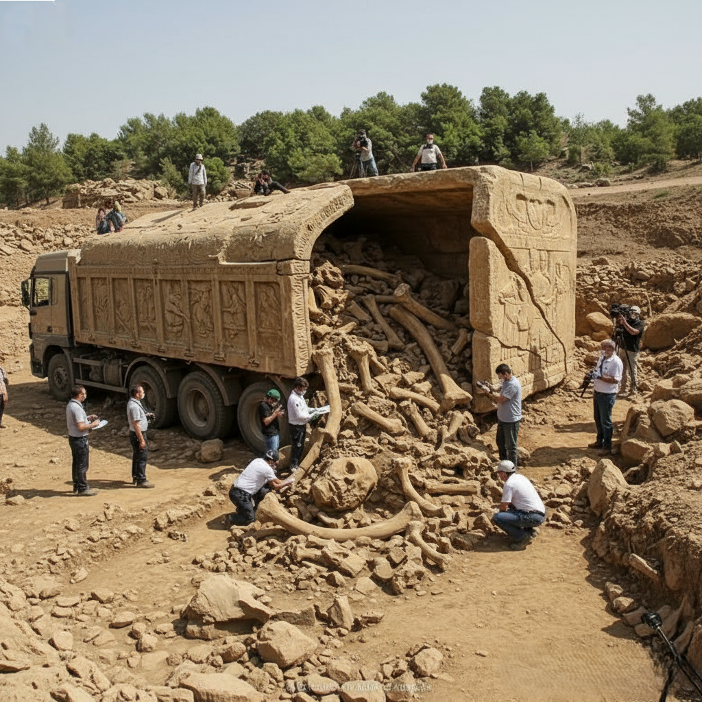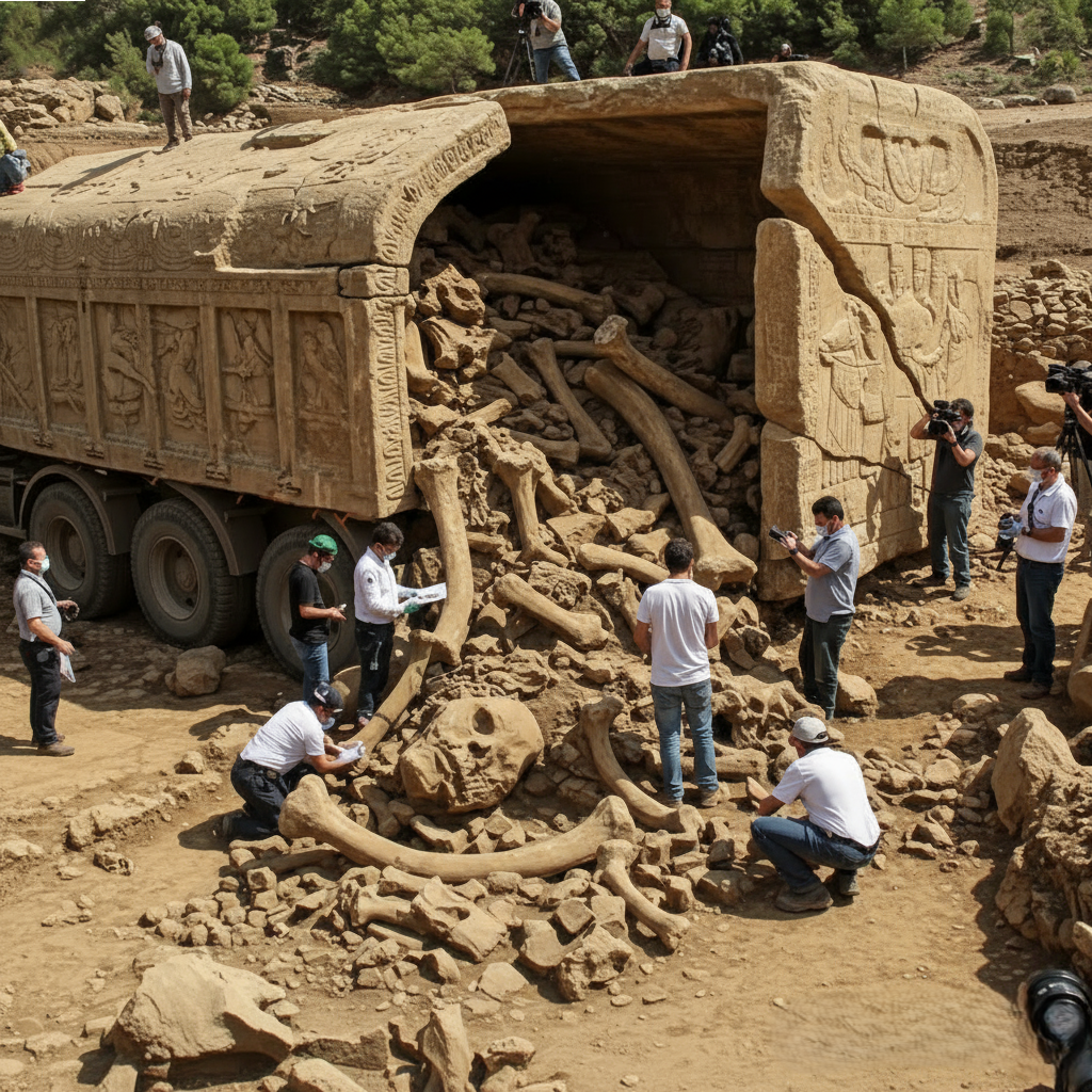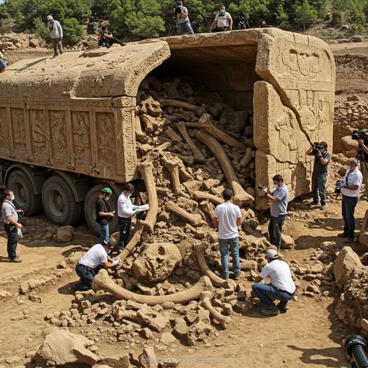 Archaeologists in a remote excavation zone have uncovered one of the most extraordinary—and unsettling—finds in modern history: a monolithic stone chamber buried deep beneath layers of sediment and volcanic ash, resembling an immense sarcophagus or ark. Measuring over twelve meters in length and carved from a single block of black basalt, the structure was sealed with a perfectly fitted lid covered in intricate inscriptions. When the team painstakingly lifted it open, they were met with a sight that defied belief — a chamber brimming with massive fossilized bones belonging to beings of colossal stature.