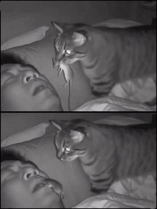 But instead of quietly disposing of her prey, Mittens, glowing with pride, brought her trophy straight to her owner. She gently placed the dead mouse directly on his lips as he slept, as if to say: “See? The job is done, human. You’re welcome.”
