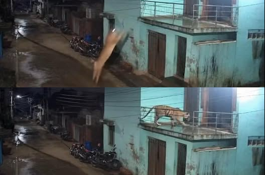 Demanding to see the CCTV footage from across the road, the tape revealed an unbelievable sight: the tiger had launched itself more than 18 feet (5.5 meters) into the air, clearing the second-floor railing in a single, powerful bound.