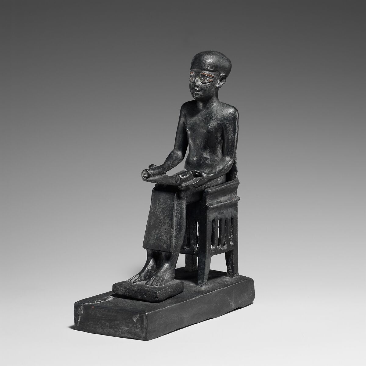 A bronze statuette of Imhotep  , whose name means “the one who comes in peace.” Dating to Egypt’s Late Period (672–332 BCE)  , this figure represents Imhotep, the brilliant polymath, architect, physician, and priest who served as royal chancellor to King Djoser during the 3rd Dynasty (ca. 2630–2611 BCE)  . Revered for designing the Step Pyramid at Saqqara and later deified as a god of wisdom and medicine
