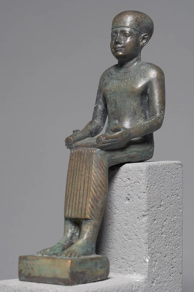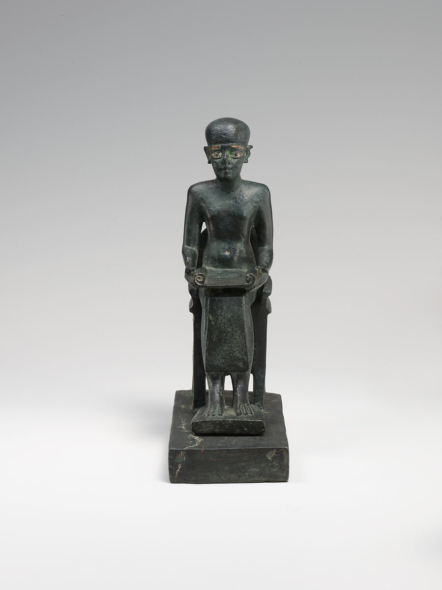 A bronze statuette of Imhotep  , whose name means “the one who comes in peace.” Dating to Egypt’s Late Period (672–332 BCE)  , this figure represents Imhotep, the brilliant polymath, architect, physician, and priest who served as royal chancellor to King Djoser during the 3rd Dynasty (ca. 2630–2611 BCE)  . Revered for designing the Step Pyramid at Saqqara and later deified as a god of wisdom and medicine