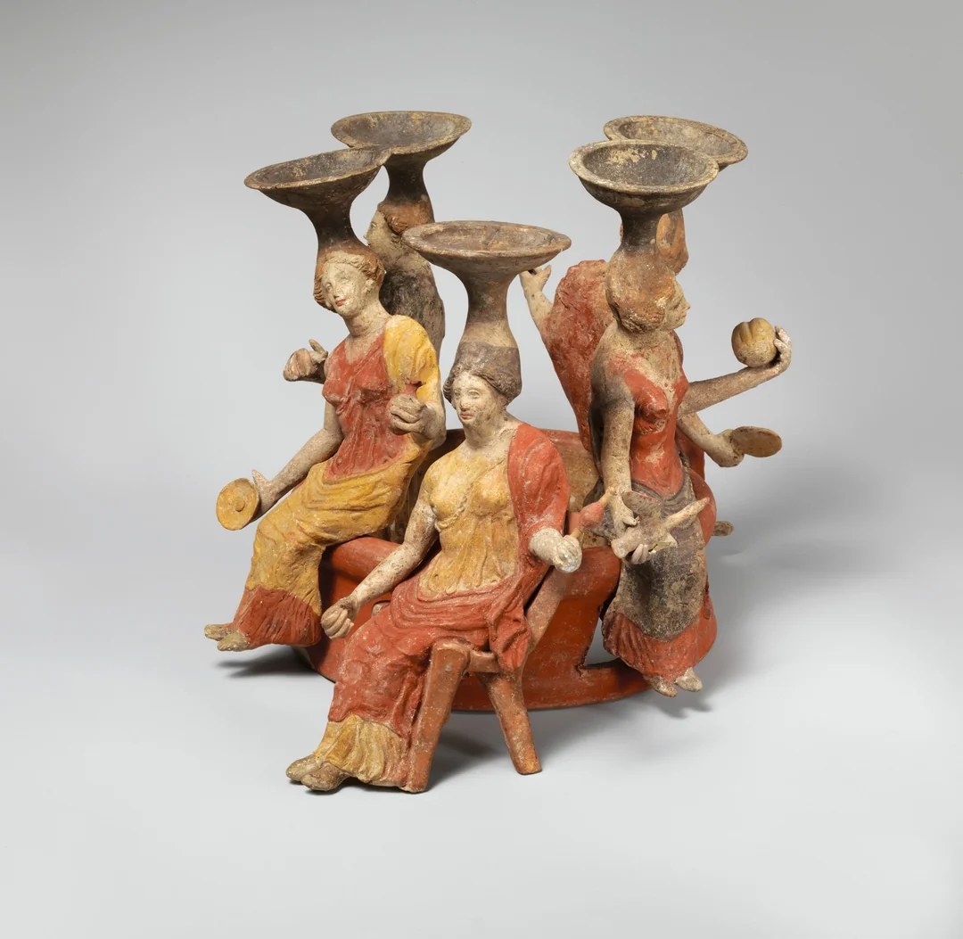 A terracotta group depicting women seated around a wellhead , crafted in Southern Italy during the second half of the 4th century B.C. This charming Greek sculpture captures a serene moment of daily life, reflecting both elegance and intimacy in ancient domestic scenes.