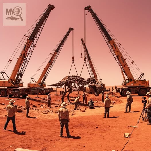 Under the relentless blaze of the desert sun, a colossal excavation unfolds amid blood-red dunes that look more like Mars than Earth. Dozens of workers in reflective suits guide industrial cranes as they hoist what appears to be the fossilized remains of a gigantic creature — a skeleton so vast and alien in proportion that even the most seasoned paleontologists on-site appear bewildered. Witnesses describe the atmosphere as “otherworldly,” with the strange crimson soil and windswept ridges framing a discovery that may rewrite the very history of life on our planet.