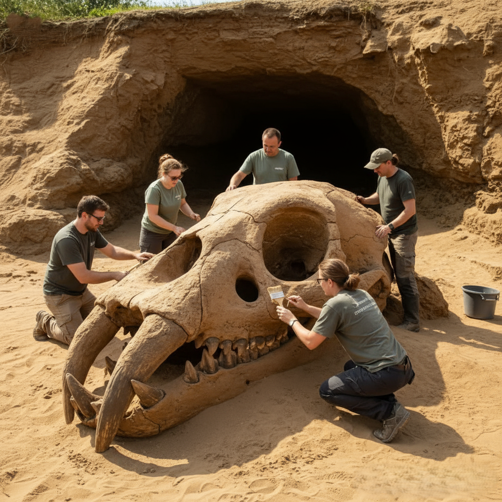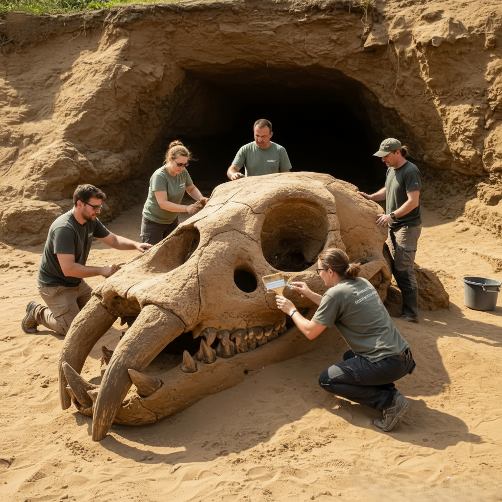 In a finding that has sent shockwaves through the global archaeological community, researchers excavating a remote desert region have uncovered an enormous skull partially embedded in the rock face of a long-sealed cave system. Measuring over three meters in length, the fossilized remains possess tusk-like fangs protruding from the jawline and a cranial cavity larger than that of any known land predator. The bone density alone suggests a creature of immense power — one that may have ruled this region thousands, or even millions, of years ago.