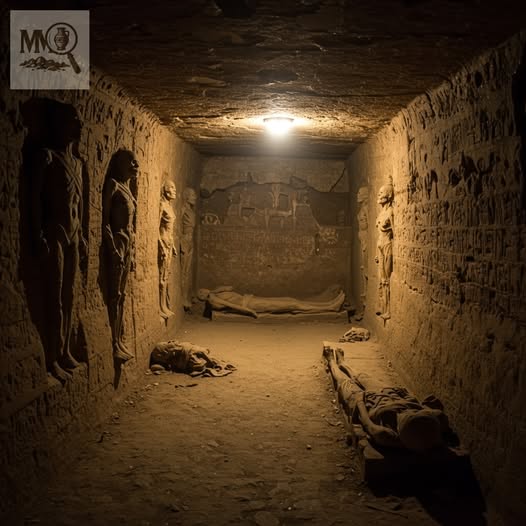 Deep beneath the shifting sands of an undisclosed desert region, a team of archaeologists has stumbled upon what may be one of the most haunting discoveries in modern history — a sealed burial chamber untouched for millennia. Hidden behind a labyrinth of narrow tunnels and collapsed stone corridors, the explorers uncovered a vast subterranean hall lined with lifelike humanoid figures standing in perfect formation along the walls. Their faces — eerily expressive, eyes wide and glassy — seem to follow intruders as they move through the dim light.