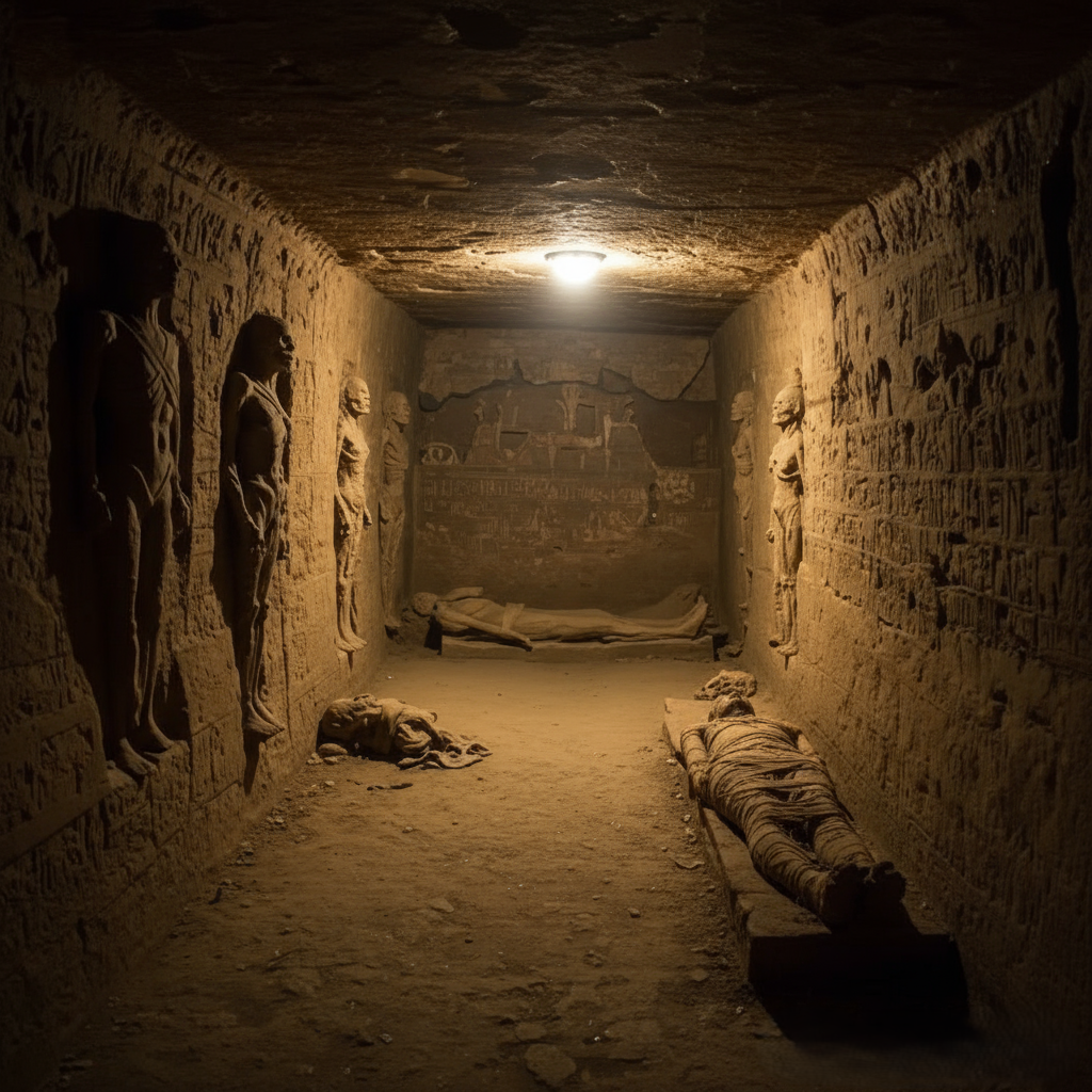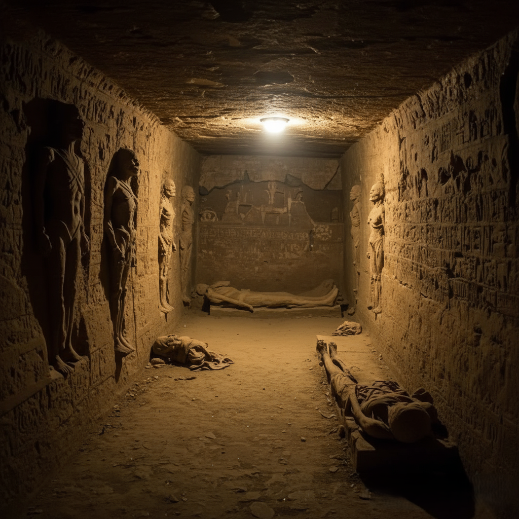 Deep beneath the shifting sands of an undisclosed desert region, a team of archaeologists has stumbled upon what may be one of the most haunting discoveries in modern history — a sealed burial chamber untouched for millennia. Hidden behind a labyrinth of narrow tunnels and collapsed stone corridors, the explorers uncovered a vast subterranean hall lined with lifelike humanoid figures standing in perfect formation along the walls. Their faces — eerily expressive, eyes wide and glassy — seem to follow intruders as they move through the dim light.