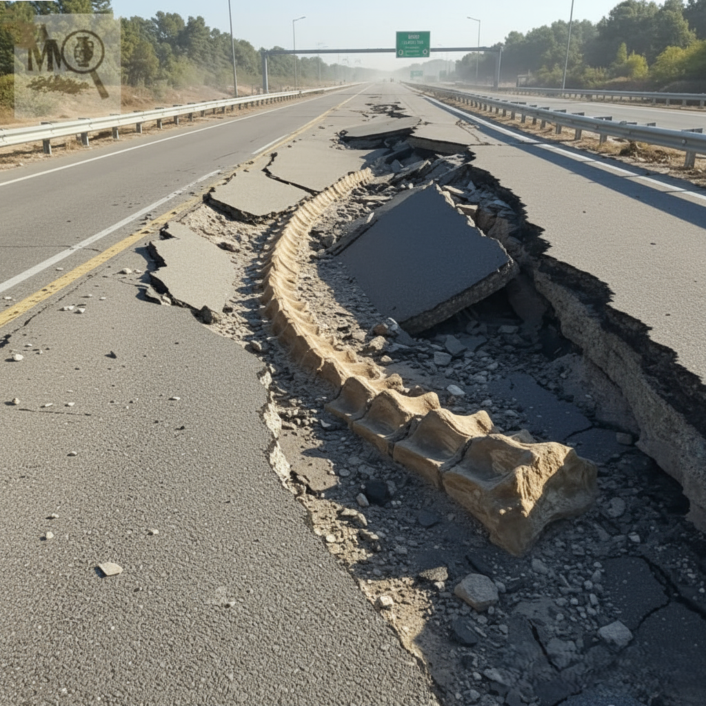 A major stretch of interstate was abruptly shut down this morning after a massive highway fissure exposed what experts are calling one of the most extraordinary paleontological finds of the century — a fossilized spinal column spanning nearly 30 meters, embedded deep beneath layers of asphalt and sediment.