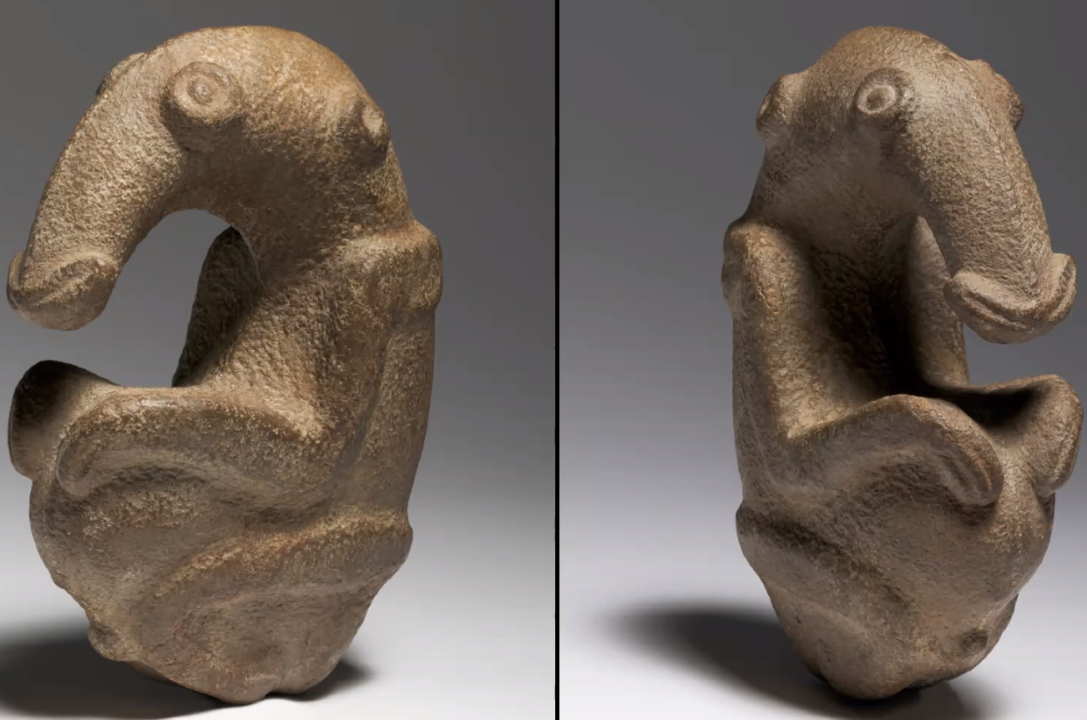 Carved from greywacke stone, the figure’s exact subject remains a mystery, though it is often thought to represent a baby echidna (spiny anteater)  .