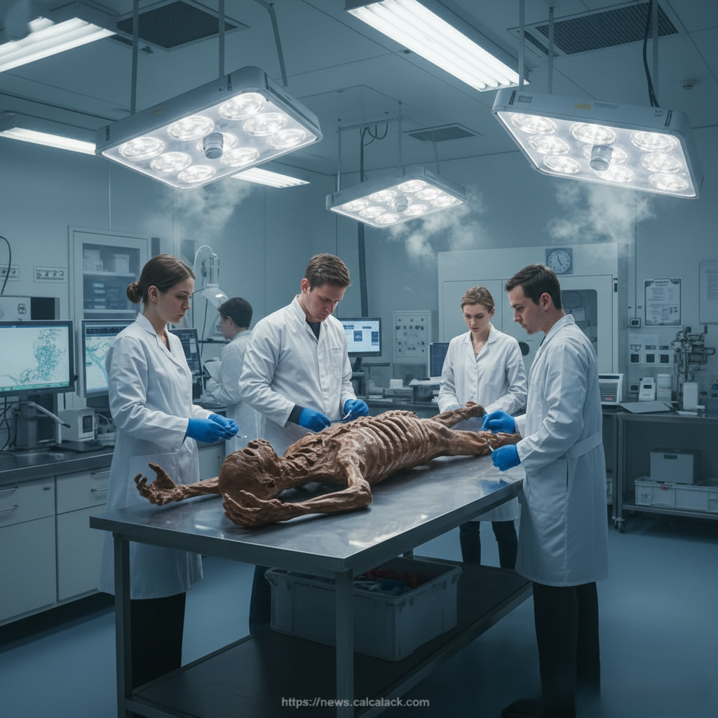 Inside the temporary research facility, samples of ice and tissue are being analyzed under extreme security. So far, no public statement has been released by the scientific team or government officials. Yet a series of leaked laboratory photos circulating online appear to show a figure with grayish, leathery skin, hollow eyes, and a partially fossilized rib structure. The authenticity of these images remains unverified, but their existence has only deepened the mystery.