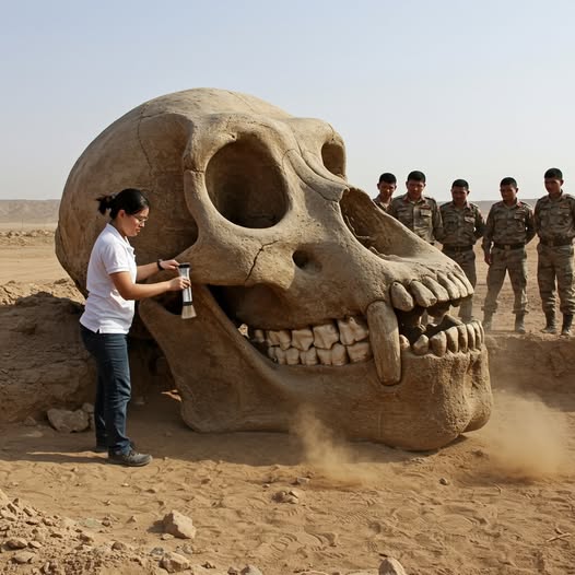 In a desolate stretch of desert, far from civilization, a team of archaeologists has stumbled upon what could be one of the most unsettling discoveries in modern history — a massive humanoid skull buried deep beneath centuries of shifting sand. Measuring over two meters from crown to chin, the skull’s sheer scale and anatomical structure defy all known classifications within the human lineage. Its jawbone alone could easily engulf a human head, and the tooth size and cranial thickness suggest the being it belonged to once stood several times taller than any recorded human in existence.
