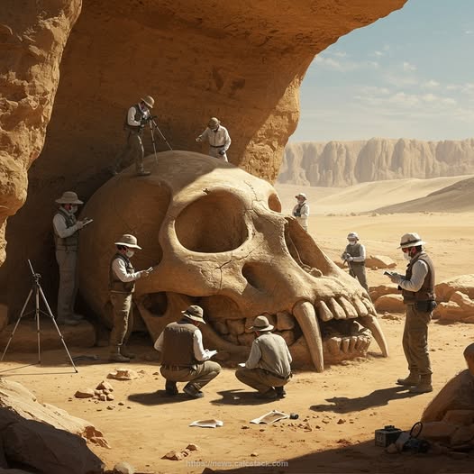In a remote desert canyon surrounded by towering cliffs and endless dunes, a team of international archaeologists has made what may be one of the most astonishing discoveries in modern history — the fossilized skull of a gigantic creature embedded deep within layers of sandstone. Measuring several meters tall, the skull features enormous fangs, thick cranial ridges, and hollow bone chambers that seem to defy every known classification of Earth’s evolutionary record.