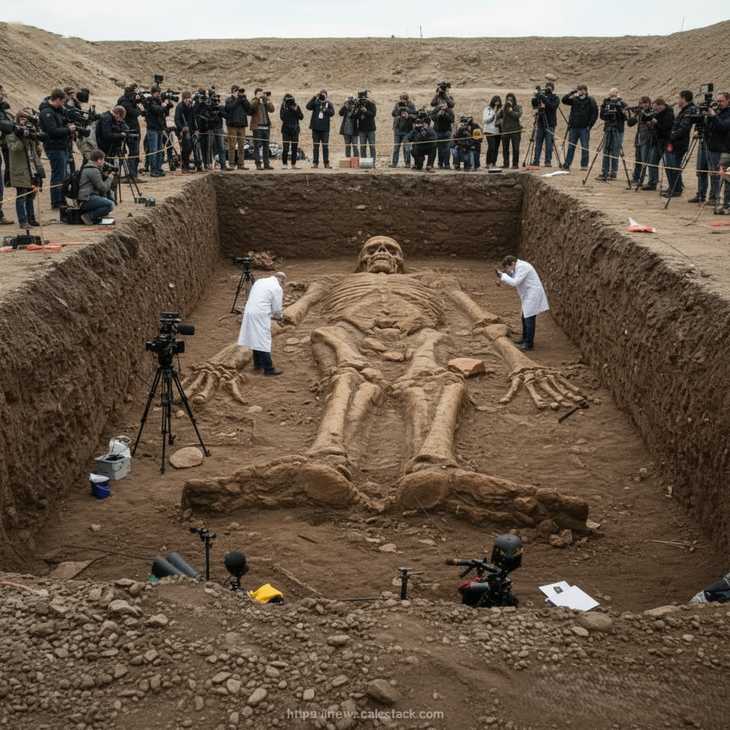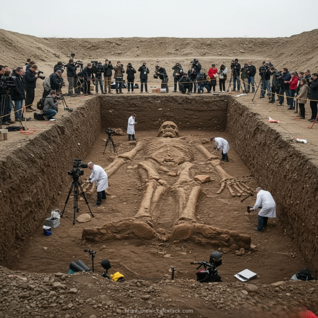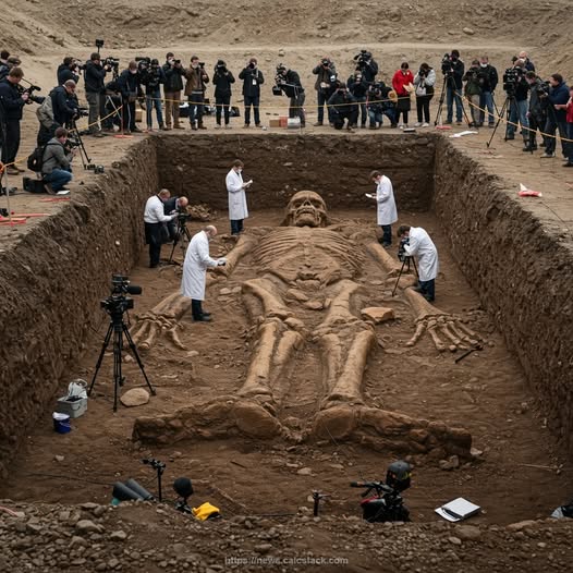 The entire world is reeling after the unprecedented unearthing of a colossal humanoid skeleton — captured live by media crews and broadcast across multiple international networks. The dig site, located in a remote and heavily restricted zone, has now become the center of global attention and fierce scientific controversy. Standing at an estimated 24 feet tall, the skeletal remains appear eerily human in structure — with a ribcage, skull, and limb proportions almost identical to modern Homo sapiens, yet on a monumental scale that defies evolutionary logic.