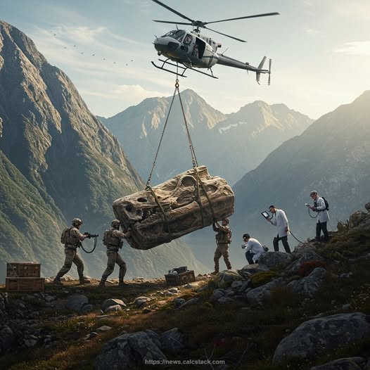 Local mountaineers first reported the find after stumbling upon strange rock formations protruding from a cliff face. When archaeologists arrived to investigate, they realized the “rocks” were in fact massive bone structures, partially fossilized yet remarkably intact. Within hours, the area was cordoned off by heavily armed guards, and an official statement claimed the object was “a naturally eroded formation.” But eyewitness accounts — and leaked video showing helicopters lifting a giant skull wrapped in metallic containment nets — tell a much different story.