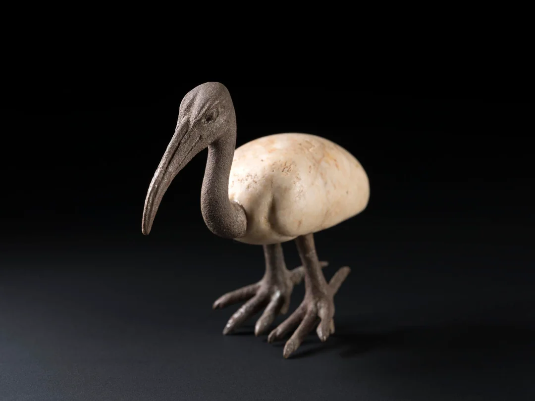 This votive statuette depicts an ibis, crafted with a body of travertine (Egyptian alabaster) and a head and legs of copper alloy. In ancient Egypt, the ibis was a sacred manifestation of Thoth — the god of divine wisdom, writing, and judgment. The particular species associated with Thoth is the African Sacred Ibis (Threskiornis aethiopicus), which became extinct in Egypt during the mid-19th century. Characterized by its white body and black head, wing tips, and tail, the bird’s coloration is reflected in this piece. The statuette may originally have included an additional dark-colored element for the tail, now missing.