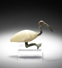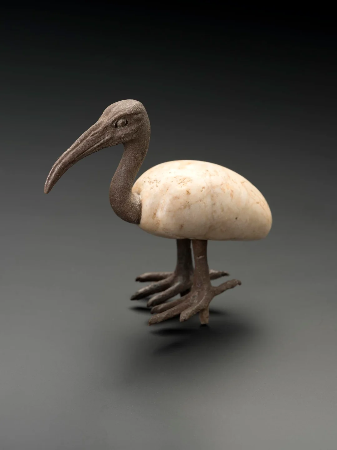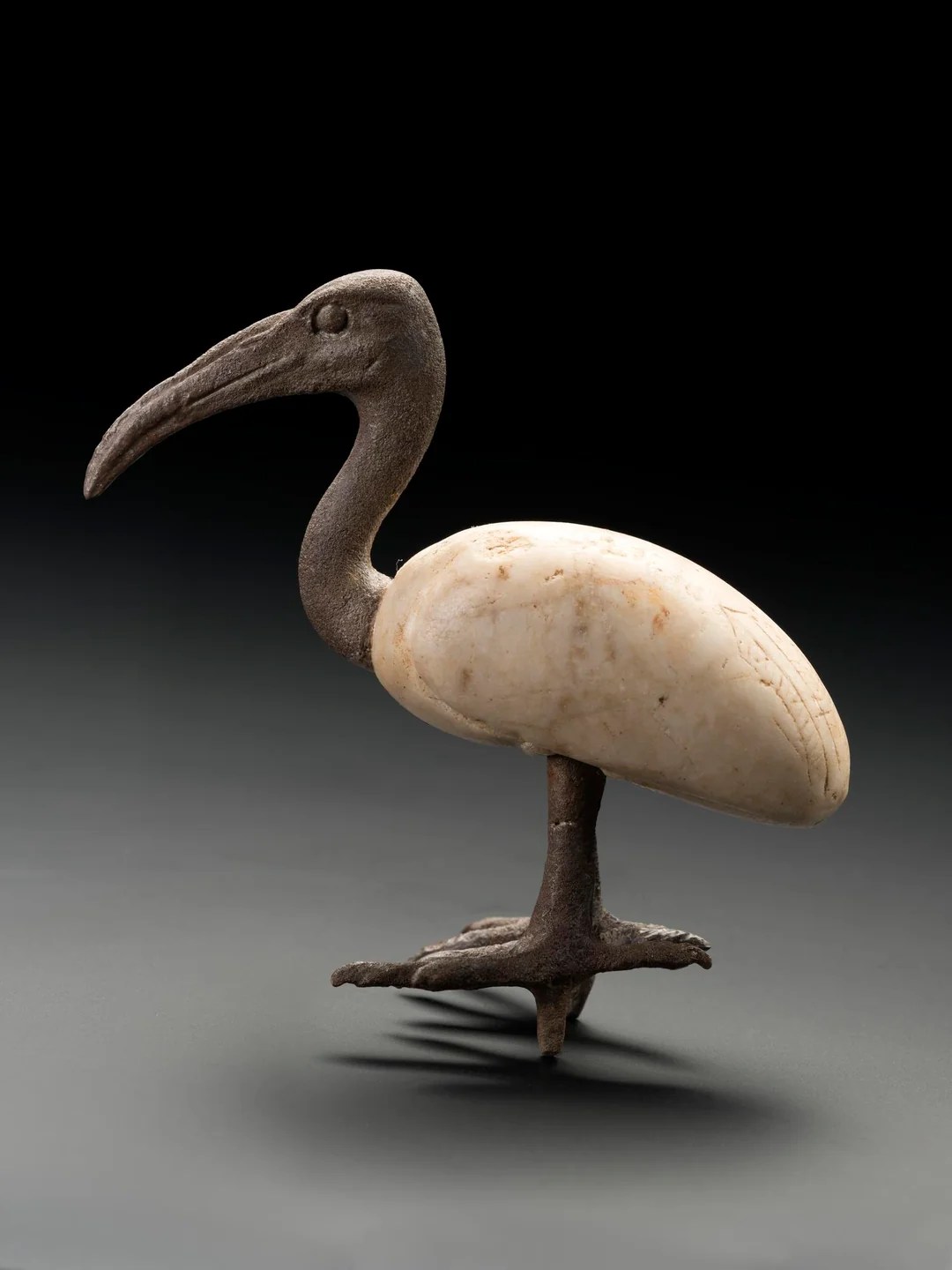 This votive statuette depicts an ibis, crafted with a body of travertine (Egyptian alabaster) and a head and legs of copper alloy. In ancient Egypt, the ibis was a sacred manifestation of Thoth — the god of divine wisdom, writing, and judgment. The particular species associated with Thoth is the African Sacred Ibis (Threskiornis aethiopicus), which became extinct in Egypt during the mid-19th century. Characterized by its white body and black head, wing tips, and tail, the bird’s coloration is reflected in this piece. The statuette may originally have included an additional dark-colored element for the tail, now missing.