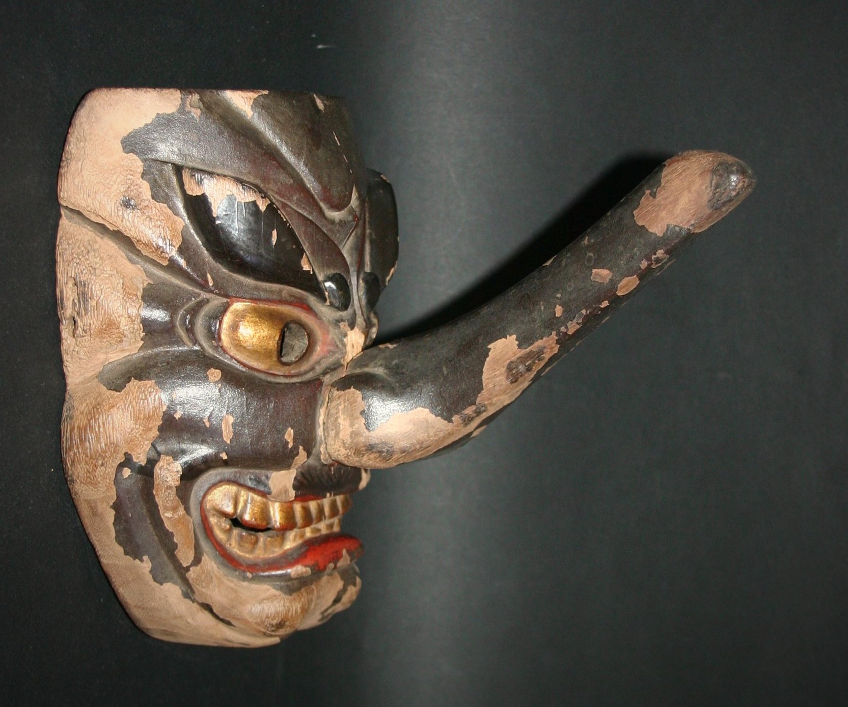 During the Edo period, masks like this one were crafted with remarkable skill from wood and finished with layers of lacquer to achieve a glossy, durable surface. The sharp eyebrows, bulging eyes, and long protruding nose express the Tengu’s supernatural strength and arrogance, traits often associated with warrior monks or Yamabushi (mountain ascetics).