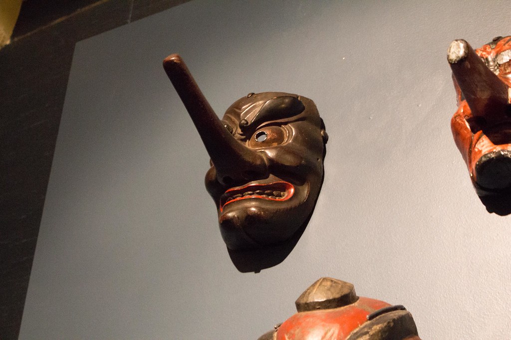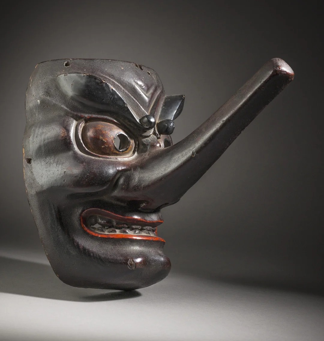During the Edo period, masks like this one were crafted with remarkable skill from wood and finished with layers of lacquer to achieve a glossy, durable surface. The sharp eyebrows, bulging eyes, and long protruding nose express the Tengu’s supernatural strength and arrogance, traits often associated with warrior monks or Yamabushi (mountain ascetics).