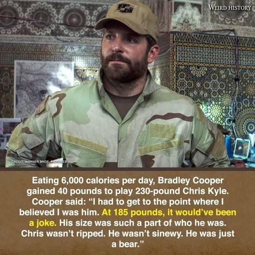 For months, the actor underwent an intense physical and mental transformation, consuming over 6,000 calories a day and training relentlessly to gain 40 pounds of muscle. The goal wasn’t vanity; it was truth. Cooper understood that to honor Kyle’s memory, he had to embody his strength, endurance, and quiet resilience. “At 185 pounds, it would’ve been a joke,” Cooper once said. “Chris wasn’t ripped. He wasn’t sinewy. He was just a bear.” That statement revealed his dedication to portraying Kyle as he truly was — not a Hollywood ideal, but a grounded, powerful man shaped by service and sacrifice.