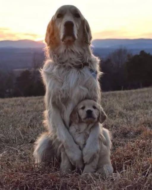 In the fading glow of sunset, an old golden retriever named Cooper sat in the tall grass, his fur touched with silver and his breath slow but content. Between his paws, his little pup, Bailey, nestled close — safe, warm, and blissfully unaware of the weight in the air. The world around them had gone still, wrapped in that quiet kind of peace that holds both love and goodbye in its silence.