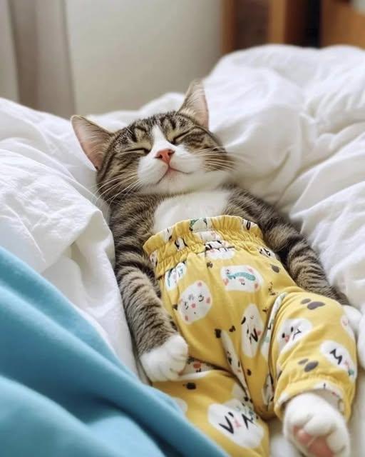 One viral image that embodies the lighthearted spirit of this trend shows a cat lying comfortably on a bed, dressed in tiny pajama pants with cartoon prints. The relaxed feline looks as though it has fully embraced its new persona, whatever name that might be.