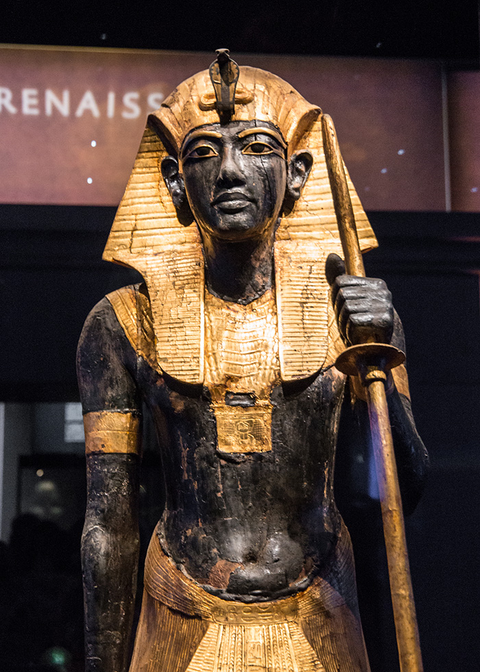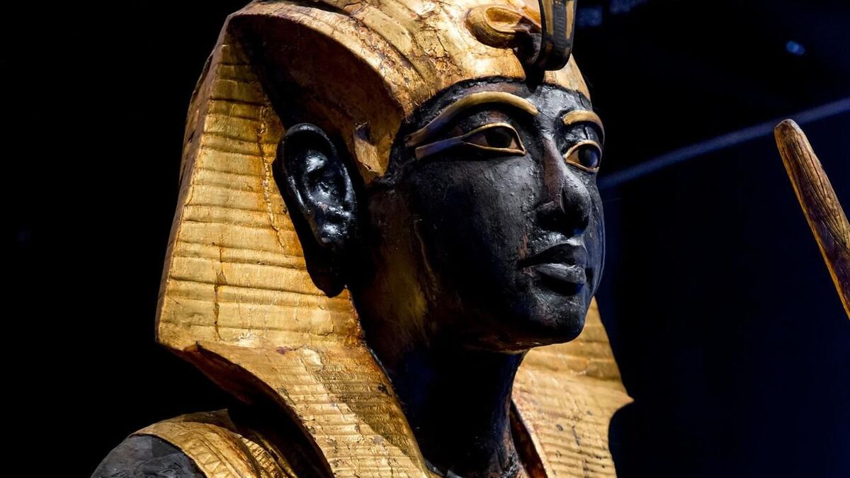 The face of one of the guardian statues from King Tutankhamun’s tomb was crafted from gilded wood, with black resin used to fill the pores of the surface. This figure is among the treasures unearthed in 1922 by archaeologist Howard Carter, who made the world-famous discovery of Tutankhamun’s tomb.