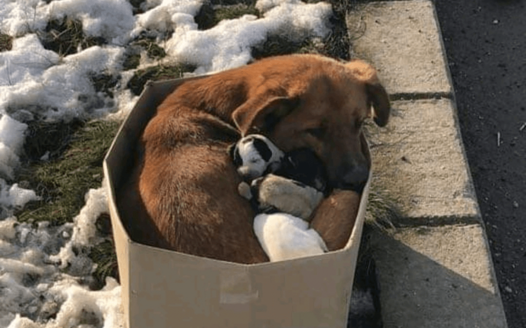 🐕 Inside was a sight that stole my breath. A mother dog, curled tightly around her three newborn puppies. She trembled—not only from the brutal cold, but from hunger, fear, and the weight of holding on when everything told her to give up. Yet still, her fragile body was their shelter, her heartbeat their only warmth against the -2°C wind.