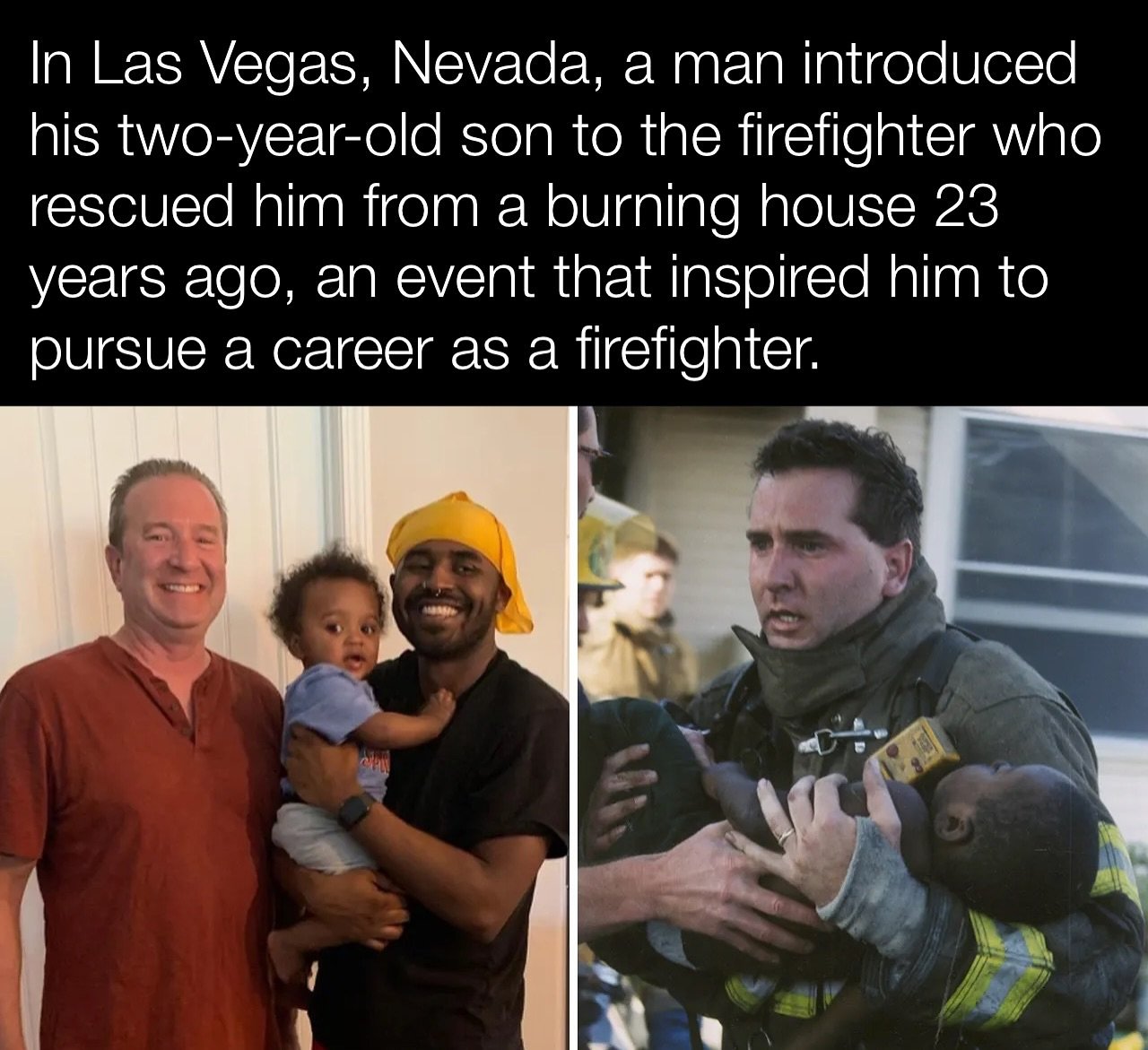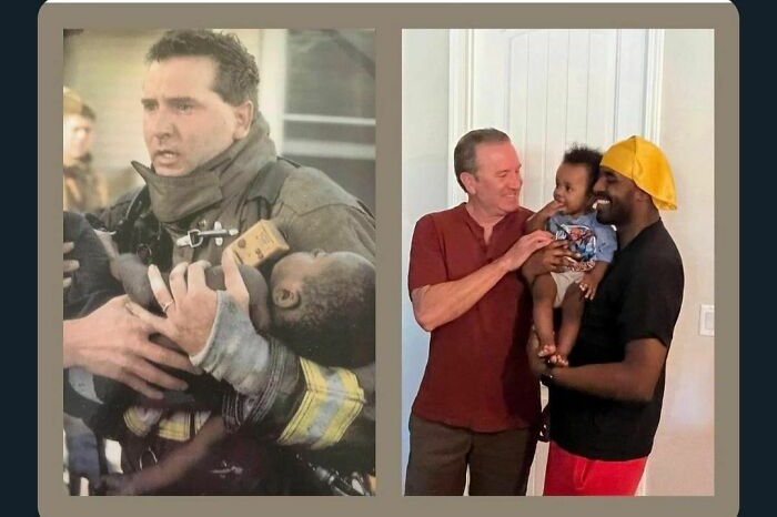 💫 Decades passed. That boy grew up, carrying in his heart a story of survival and an unshakable gratitude for the man who gave him a second chance at life. And then, one extraordinary day, the story came full circle. With tears glistening in his eyes, the grown man placed his own 2-year-old son into the arms of the same firefighter who had once carried him.